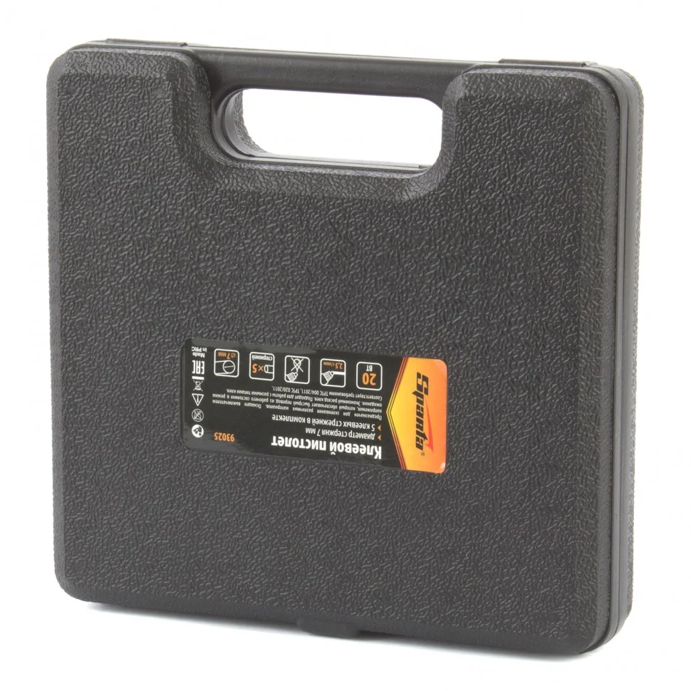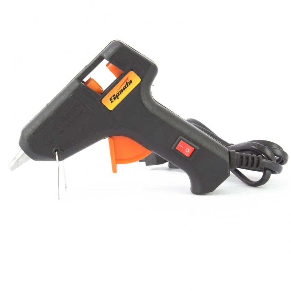 Клеевой пистолет Sparta 93025, 7 мм, 20 Вт, 2,5 г/мин, в кейсе, пригодится при проведении несложных бытовых работ: склеивания бумаги, дерева, пластика и других материалов. Он станет незаменимым помощником для частных мастеров, которые занимаются мелким ремонтом, упаковкой, сборкой различных моделей и рукоделием. Время нагрева до максимальной температуры не превышает 5,5 минут.ПреимуществаКорпус из ударопрочной пластмассы устойчив к механическим повреждениям.Во время работы пистолет можно устанавливать на металлическую скобу-подставку, это повышает удобство эксплуатации.Специальное окошко позволяет отслеживать уровень расхода стержня внутри ствола.Противокапельная система обеспечивает оптимальный расход клея.Пластиковый кейс позволяет с удобством хранить и транспортировать пистолет.