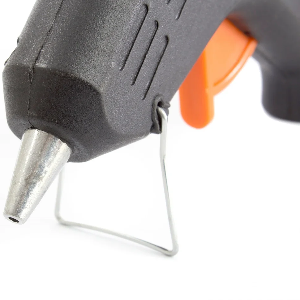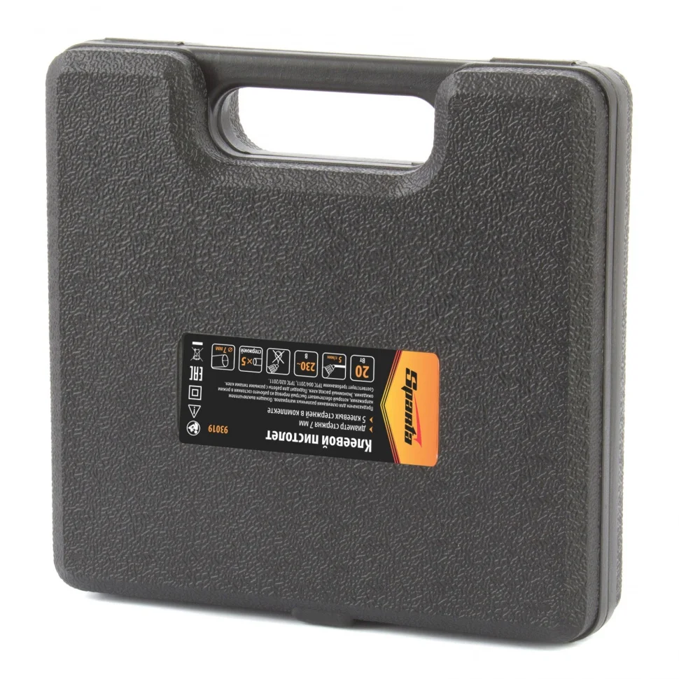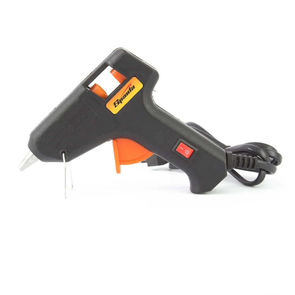 Клеевой пистолет Sparta 93019, 7 мм, 20 Вт, 5 г/мин, в кейсе, пригодится при проведении несложных бытовых работ: склеивания бумаги, дерева, пластика и других материалов. Он станет незаменимым помощником для частных мастеров, которые занимаются мелким ремонтом, упаковкой, сборкой различных моделей и рукоделием. Время нагрева до максимальной температуры не превышает 5,5 минут.ПреимуществаКорпус из ударопрочной пластмассы устойчив к механическим повреждениям.Во время работы пистолет можно устанавливать на металлическую скобу-подставку, это повышает удобство эксплуатации.Специальное окошко позволяет отслеживать уровень расхода стержня внутри ствола.Противокапельная система обеспечивает оптимальный расход клея.Пластиковый кейс позволяет с удобством хранить и транспортировать пистолет.