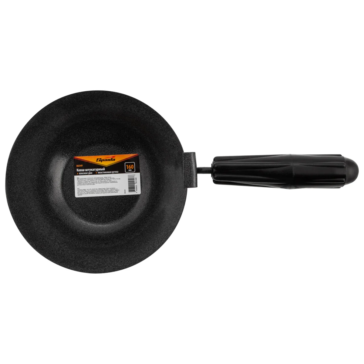Стальной строительный ковш Sparta 86349 с рабочей частью в форме усеченной полусферы диаметром 160 мм и пластиковой рукояткой предназначен для нанесения штукатурки на поверхность стен и потолков при проведении отделочных работ.