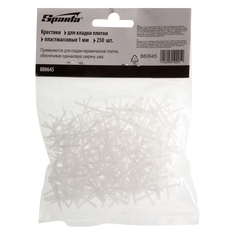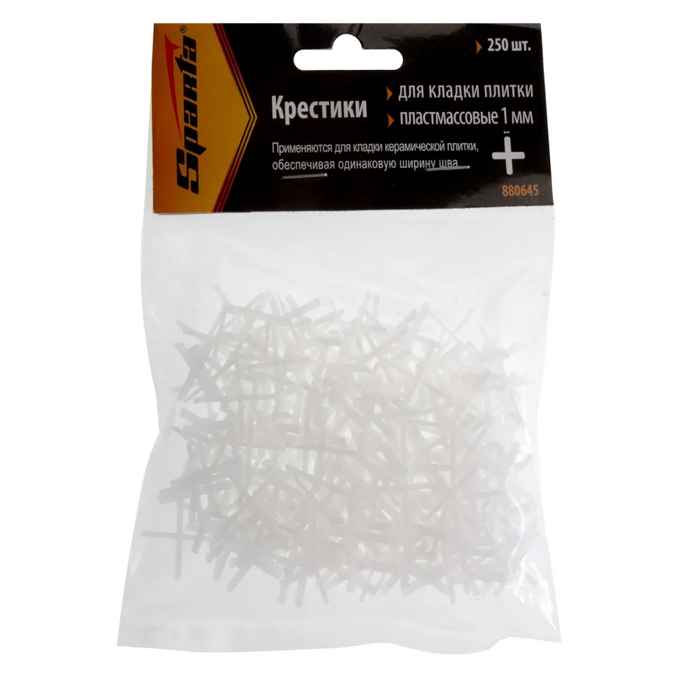 Крестики для кладки плитки Sparta 880645 размером 1 мм позволяют добиться одинакового межплиточного расстояния в ходе облицовочных работ. Облегчают укладку плиточного покрытия и повышают его эстетичность.ПреимуществаКрестики прочные и долговечные, поскольку изготовлены из пластмассы, стойкой к механическим и химическим воздействиям.Экономят время мастера, так как не прилипают к плитке и без усилий извлекаются из швов.Подходят для повторного использования, поскольку клей с них легко можно смыть обычной водой.В упаковке 250 штук, которых хватит для укладки минимум 30 плиток.