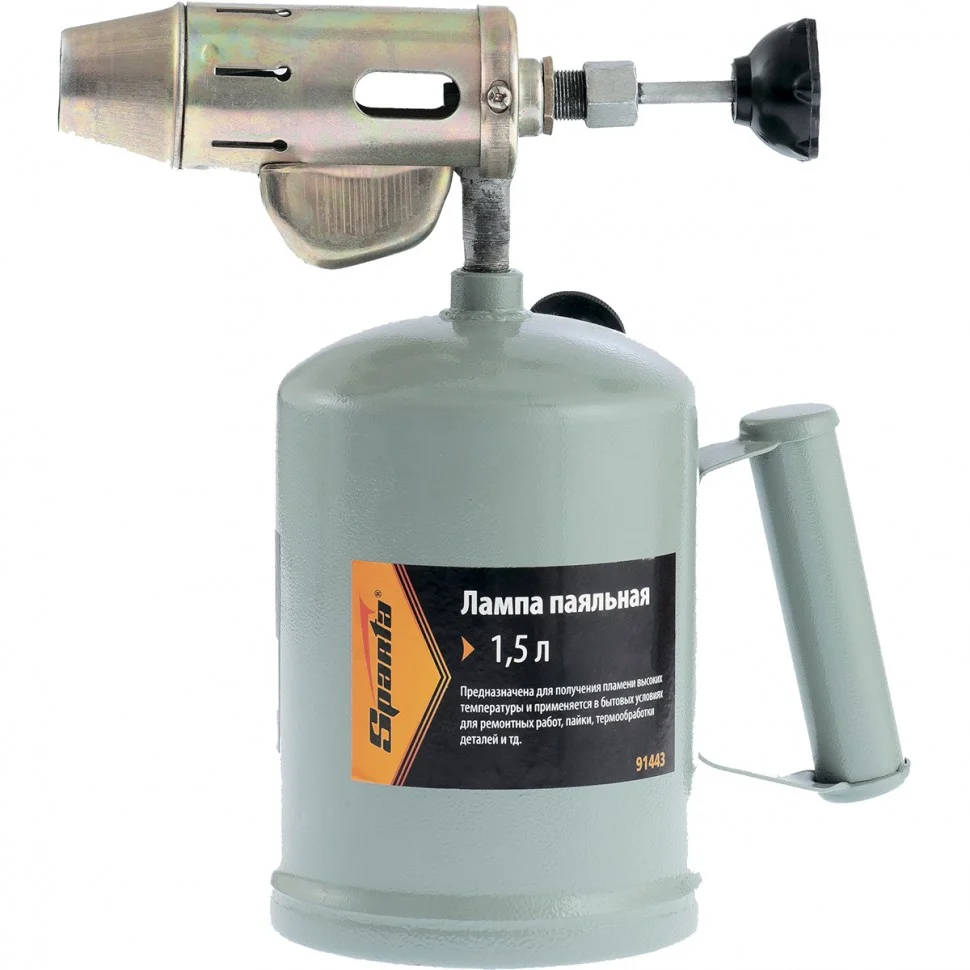 Паяльная лампа Sparta 91443 с объемом бака 1,5 л предназначена для получения направленного пламени. Используется для пайки деталей и труб, нагрева заржавевших или замерзших соединений, снятия лакокрасочных покрытий, монтажа термоусадки. Устройство также пригодится в походе или на даче — при наличии специальной подставки с его помощью можно готовить пищу. Максимальный расход топлива составляет 1,2 л/ч при предельной заполняемости бака 1,1 л.ПреимуществаПаяльная лампа надежная и долговечная, т.к. корпус и рукоятка изготовлены из прочной стали ST-12.Можно контролировать подачу топлива и интенсивность пламени — для этого предусмотрен регулировочный винт.Для заправки лампы не нужно искать специальное топливо — она работает на любом бензине, кроме этилированного.