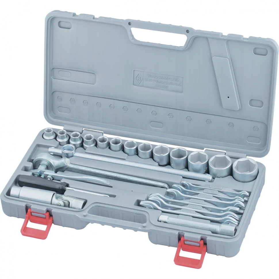 Набор «Автомобилист» НИЗ 13452 в пластиковом боксе предназначен для технического обслуживания машин и будет полезен автовладельцам. Его можно взять с собой в дорогу или использовать в гараже. Набор включает все необходимое для срочного ремонта: плоскогубцы, головку свечную 21 мм, отвертку, удлинитель для работы в труднодоступных местах, рожковые ключи, торцевые головки, шарнир и трещотку.ПреимуществаПрочность и высокий ресурс — элементы набора изготовлены из инструментальной стали 40Х, устойчивой к динамическим нагрузкам.Защита от коррозии — инструменты оцинкованы, поэтому не разрушаются под воздействием влаги.Универсальность — в комплект входит 13 торцевых головок на 10, 11, 12, 13, 14, 15, 17, 19, 22, 24, 27, 30 и 32мм.Быстрый монтаж и демонтаж резьбовых соединений с шестигранной головкой — в наборе 6 двусторонних гаечных ключей с открытым зевом типоразмера 8х10, 10х12, 12х14, 13х15, 14х17, 17х19.Комбинированная отвертка — можно работать с крепежными элементами типоразмера SL 6 и PH 3.Работа в труднодоступных местах — в комплект включены шарнир карданный и удлинитель 125 мм, а также небольшие плоскогубцы для надежного захвата и удерживания мелких деталей.Продуманная конструкция свечной головки — можно легко и безопасно установить или демонтировать свечу зажигания.Быстрый переход от монтажа к демонтажу — трещоточный ключ оснащен переключателем реверса.Удобное хранение и транспортировка — набор упакован в пластиковый кейс с указанием типоразмеров торцевых головок.