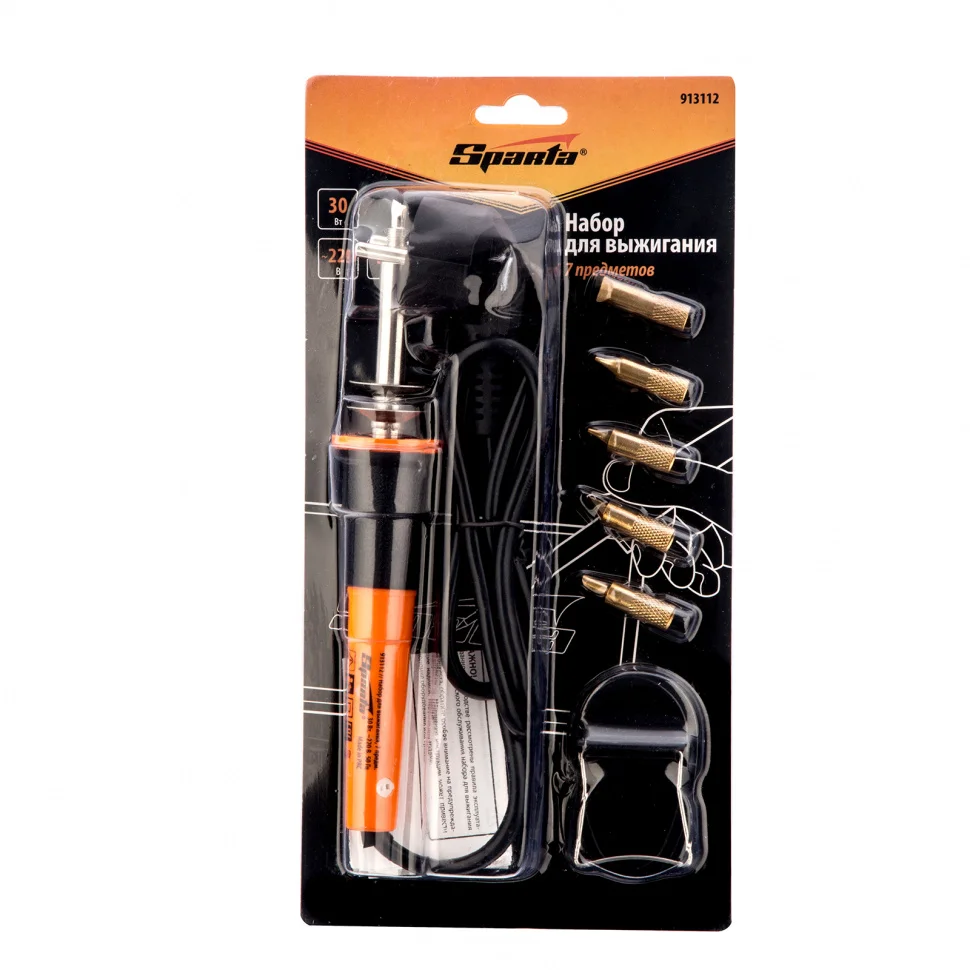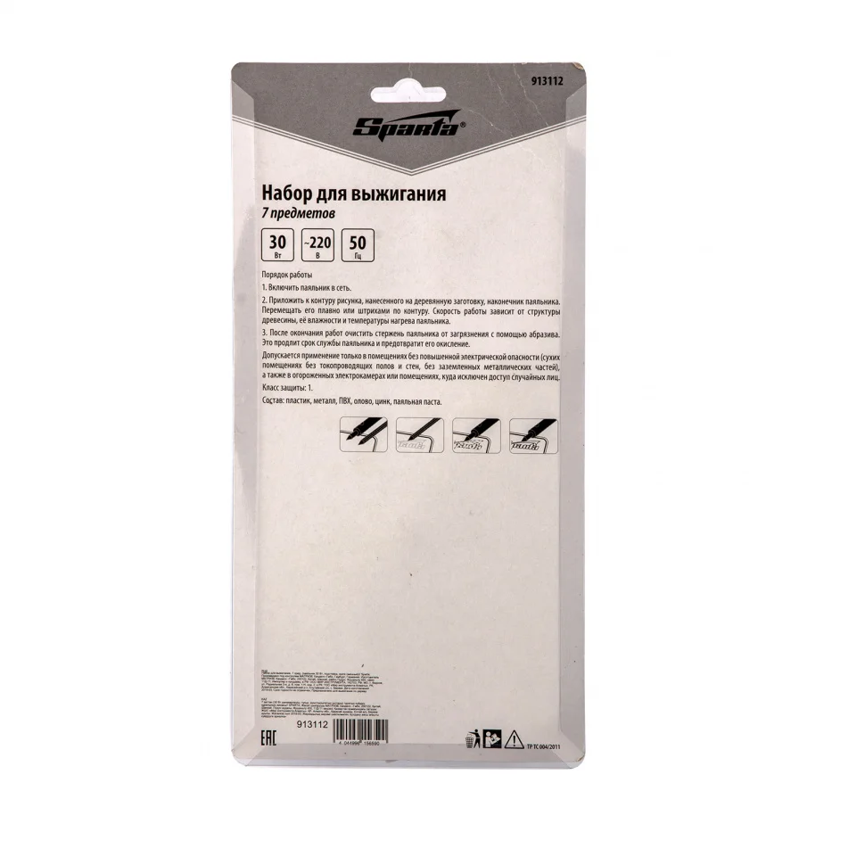 Набор для выжигания Sparta 913112 содержит все необходимое для создания изображений или орнаментов на деревянных заготовках — паяльник мощностью 30 Вт, подставку и сменные жала из латуни. Керамический нагреватель обеспечивает выжигателю стабильную работу и долговечность. Набор используется во время занятий творчеством.ПреимуществаНа пластиковой рукоятке паяльника имеется широкое резиновое кольцо, предотвращающее ее нагрев и выскальзывание из ладони.Подставка служит для размещения на ней разогретого жала, чтобы исключить повреждение столешницы.Пять сменных жал разных форм позволяют формировать линии необходимой ширины и глубины.