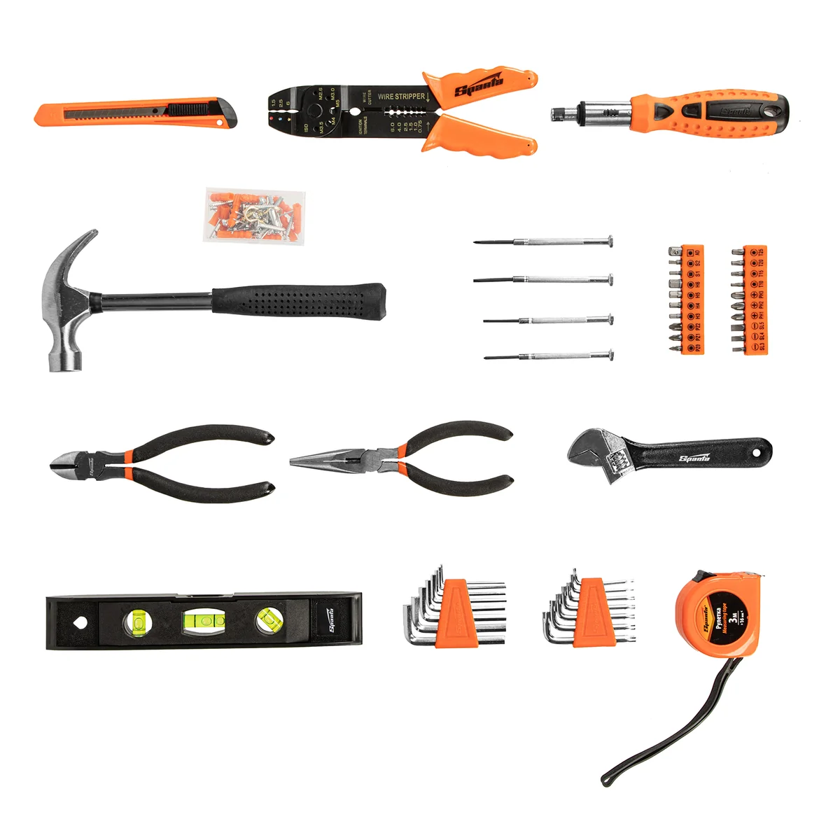 Набор инструментов Sparta 135645 включает в себя 132 предмета для бытового применения: обжимные клещи, отвертки, в том числе для точных работ, молоток-гвоздодер, бокорезы, строительный уровень, разводной и имбусовые ключи, биты-вставки с адаптером, длинногубцы, рулетку, канцелярский нож, а также набор крепежа. Инструменты оптимально подходят для выполнения слесарно-монтажных работ дома или на даче.
