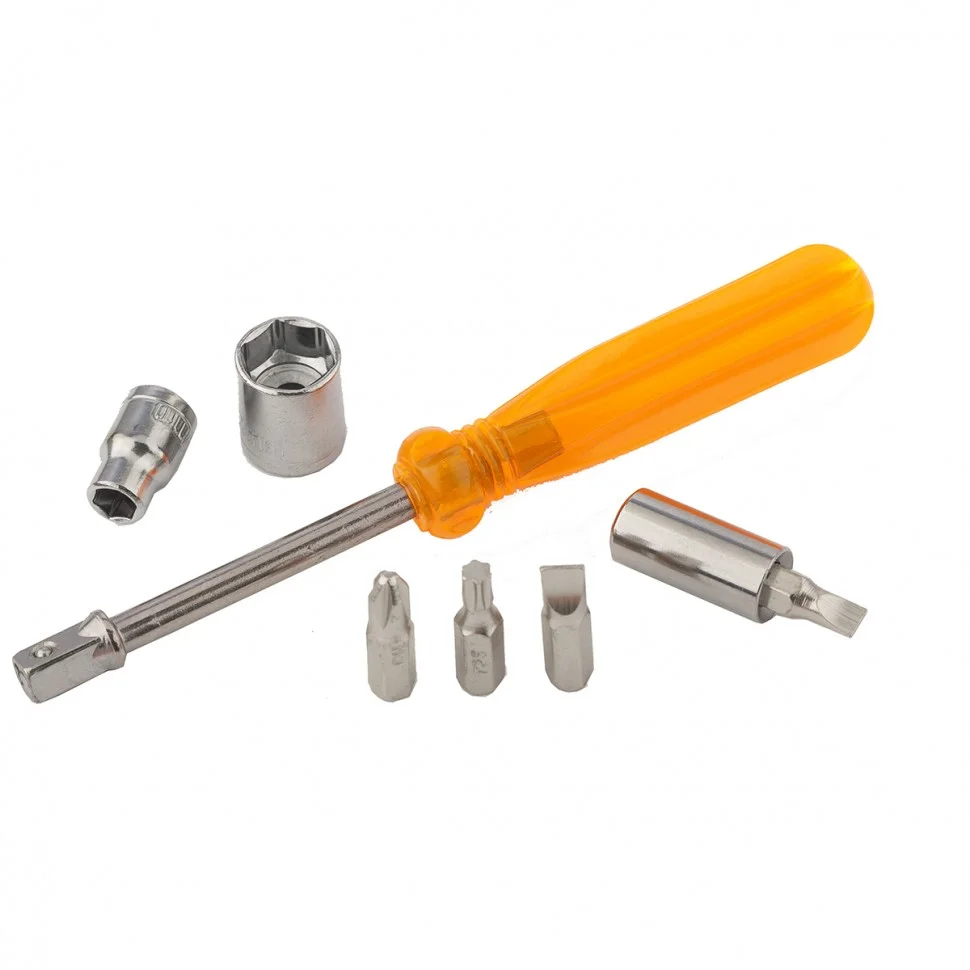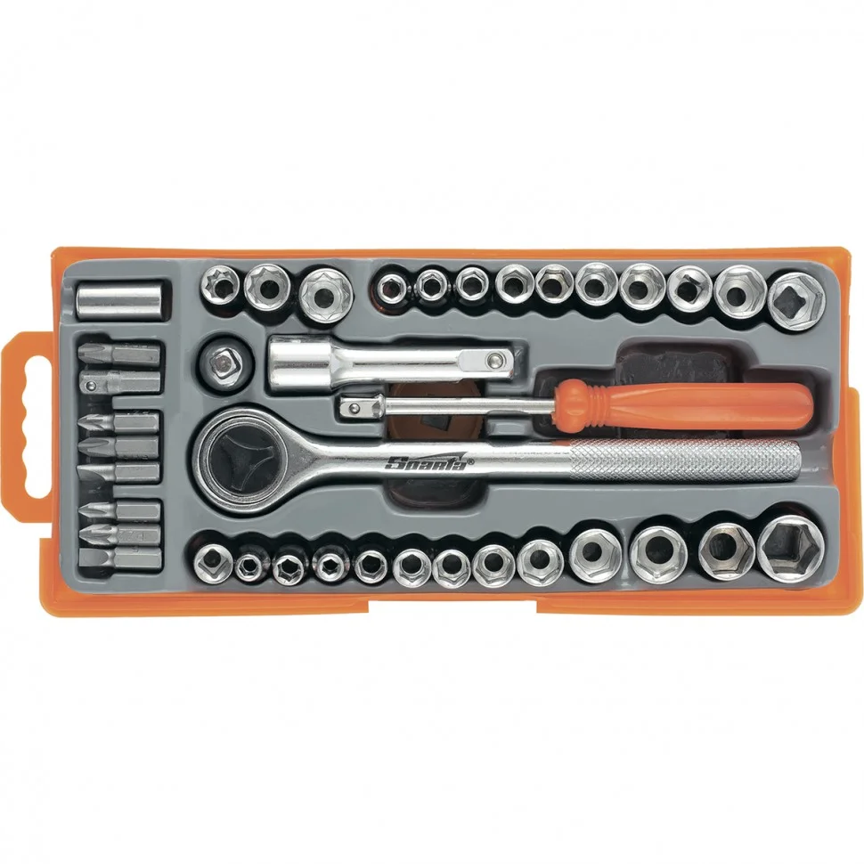 Набор Sparta 13541 содержит 37 предметов для проведения слесарно-монтажных работ. Он оптимально подходит для бытового применения, будет полезен начинающим мастерам. С помощью набора осуществляется монтаж/демонтаж резьбового крепежа.ПреимуществаИнструменты и сменные насадки выполнены из инструментальной стали и закалены, что обеспечивает им необходимые прочностные характеристики.Широкий ассортимент торцевых головок в наборе позволяет подобрать нужную в зависимости от крепежа.Реверсивная трещотка позволяет осуществлять монтаж и демонтаж резьбовых соединений.В комплект входит пластиковый диск для удобной эксплуатации реверсивной трещотки.Удлинитель на 3/8 дюйма обеспечивает доступ к резьбовым соединениям в труднодоступных местах.Ярко-оранжевый кейс с прозрачной крышкой позволяет удобно хранить и транспортировать набор, он не потеряется среди инструментов.