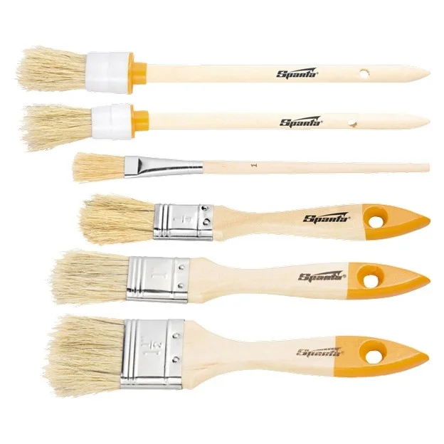 Набор плоских и круглых кистей Sparta 841145, 6 шт., пригодится при проведении покрасочных работ. Кисти с натуральной щетиной оптимальны для нанесения составов на основе растворителей, а также масляных красок. С их помощью можно получить равномерное финишное покрытие.ПреимуществаНадежность фиксации щетины обеспечивает металлический бандаж, который обработан антикоррозийным покрытием для защиты от ржавчины.Щетина расщеплена на концах, за счет чего улучшаются краскообменные свойства кистей.В состав набора входят плоские кисти размером 3/4 дюйма, 1,5 дюйма и 1 дюйм и круглые №1, №2, №4 для удобства работы на разных участках, в том числе труднодоступных и узких.На ручках имеются специальные отверстия, благодаря которым кисти можно хранить в подвешенном состоянии.