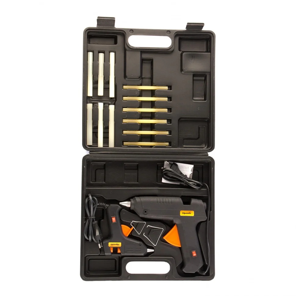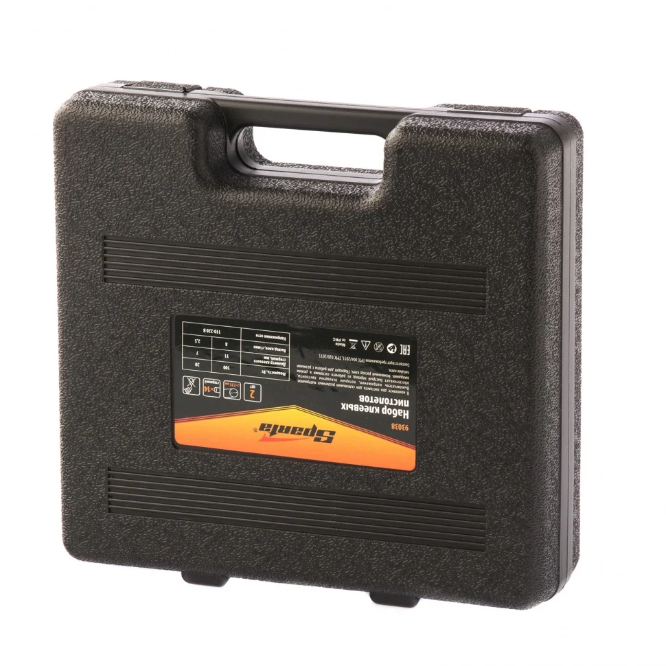 Набор Sparta 93038 в кейсе включает 2 клеевых пистолета с выключателями, мощностью 20/100 Вт, производительностью 3 и 8 г/мин, совместимых со стержнями диаметром 7 и 11 мм. Их используют для проведения несложных бытовых работ: склеивания бумаги, дерева, пластика и других материалов. Инструменты пригодятся частным мастерам при мелком ремонте, упаковке, сборке различных моделей и рукоделии.ПреимуществаНадежность — корпусы из ударопрочной пластмассы устойчивы к механическим повреждениям.Противокапельная система — клеевые стержни расходуются экономно, а рабочее место остается чистым.Быстрая подготовка к работе — время нагрева до максимальной температуры не превышает 5,5 минут.Контроль уровня расхода стержня — в пистолетах имеются смотровые окошки.Комфортная работа — конструкцией каждого инструмента предусмотрены металлическая скоба-подставка и выключатель.Удобное хранение и транспортировка — инструменты поставляются в пластиковом кейсе.