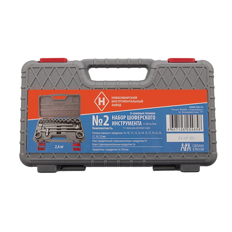 Набор шоферского инструмента № 2 НИЗ 13442 в пластиковом боксе используется для ремонта автомобиля и станет незаменимым помощником в дороге и гараже. В комплект входят ключ-трещотка и ключ с присоединительным квадратом, применяемые при монтаже и демонтаже резьбовых крепежей, а также 13 торцевых головок.ПреимуществаПрочность — инструменты изготовлены из инструментальной стали 40Х, устойчивой к динамическим нагрузкам.Коррозионная стойкость — вороток и торцевые головки оцинкованы для защиты от воздействия влаги.Надежная фиксация торцевой головки — благодаря шариковому фиксатору насадка не соскакивает с воротка.Удобное хранение и транспортировка — набор поставляется в прочном пластиковом кейсе.