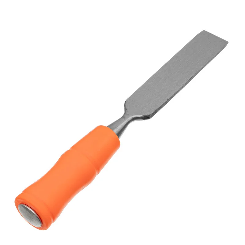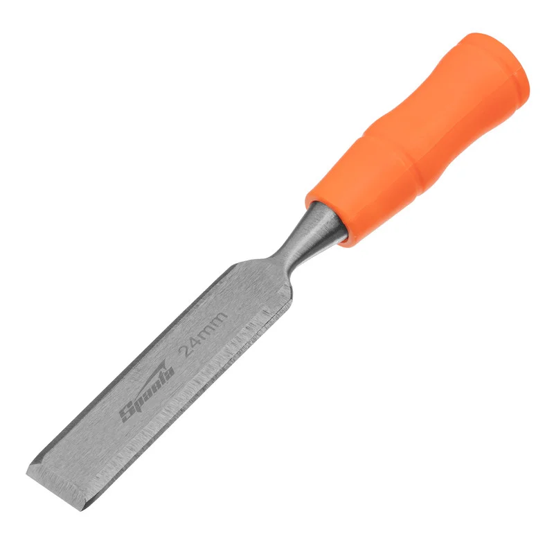 Набор плоских стамесок Sparta 243975 из 4 штук с пластиковыми ударными рукоятками, 6-12-18-24 мм, используется для работ по дереву — выборки пазов и углублений различной ширины, снятия фасок, зачистки поверхностей. Стамески выдерживают удары киянкой или молотком, т.к. металлический затыльник предохраняет рукоятку от деформации. Набор подойдет столярам, плотникам, мебельщикам, а также домашним мастерам.Преимущества Полотна сделаны из качественной конструкционной углеродистой стали 55, обеспечивающей необходимую твердость и высокую прочность инструмента. Стамески закалены до твердости 58-63 HRC (2/3 длины рабочей части полотна), это позволяет получать точный и аккуратный срез и надолго сохранять режущие свойства инструментов. Рабочие кромки режут дерево точно и быстро, сохраняют остроту до 6-12 месяцев, поскольку заточены на специальном оборудовании под углом 20-35°. Рукоятки выполнены из высокопрочной пластмассы, поэтому выдерживают ударные нагрузки без риска деформации. Стамески не затеряются среди других инструментов благодаря ярко-оранжевому цвету рукояток.