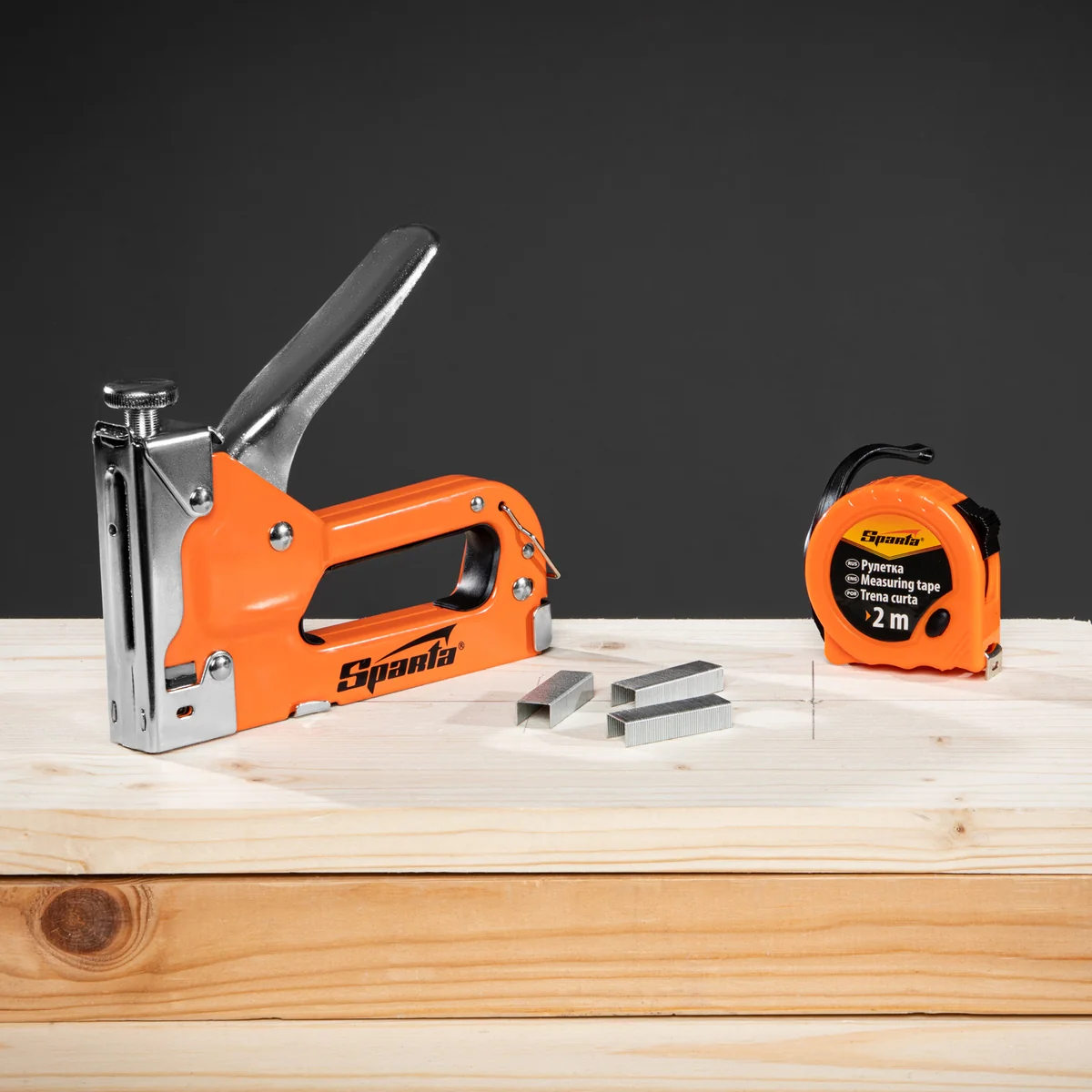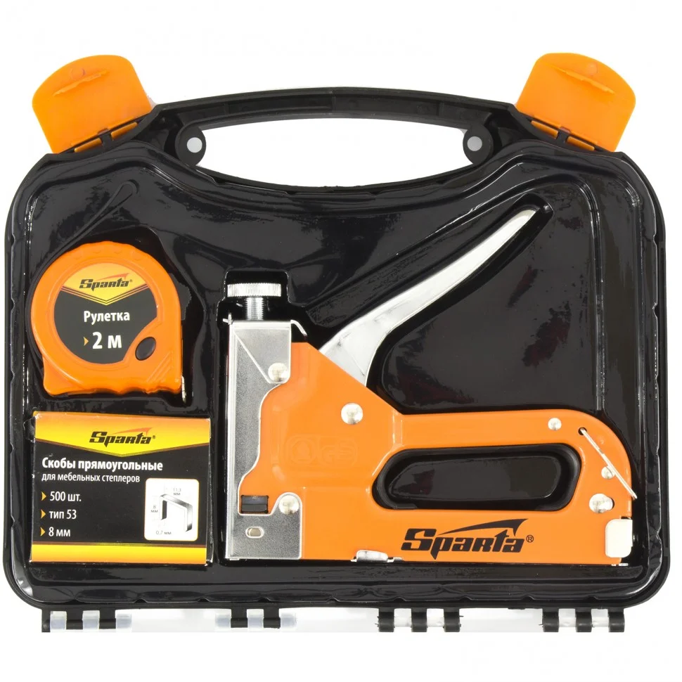 Набор Sparta 42003 состоит из мебельного регулируемого степлера, совместимого с крепежами типа 53 размером 4-14 мм, 500 скоб и рулетки с длиной ленты 2 м. Они позволяют измерять и закреплять на деревянном основании оргалит, фанеру, ДСП, ДВП, пленку, утеплитель и другие листовые материалы. Штампованный стальной корпус степлера устойчив к деформации, поэтому инструмент прослужит долго. Набор будет полезен для сборки и перетяжки мебели, укладки напольных покрытий и монтажа теплоизоляционного материала. Подходит для бытового применения.Преимущества Поверхность степлера окрашена, поэтому инструмент не боится коррозии. У степлера имеется возможность плавной регулировки силы удара, что важно при работе с материалами разной плотности. Металлическая скоба фиксирует рукоятку в горизонтальном положении, что исключает риск случайного срабатывания ударного механизма во время хранения и транспортировки. В комплект включена упаковка из 500 скоб размером 8 мм, которых хватит надолго.