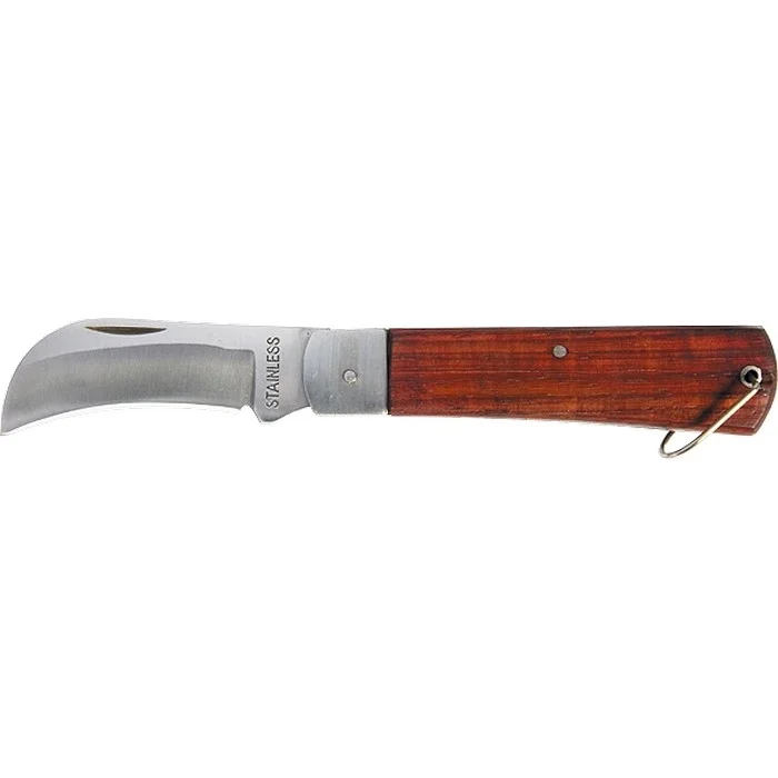 Складной нож Sparta 78999 с загнутым лезвием и деревянной ручкой эффективно справляется с резкой резиновых, кожаных, картонных изделий и напольных покрытий. За счет своей универсальности он будет полезен профессиональным и частным мастерам, туристам, любителям отдыха на природе.ПреимуществаОстрозаточенное лезвие из нержавеющей высококачественной стали 3Hr13 обладает высокой износостойкостью и прочностью.Деревянная ручка не скользит в руке и приятна по тактильным ощущениям, поэтому с ножом комфортно работать.Складной нож весом 133 г удобен в использовании и транспортировке.