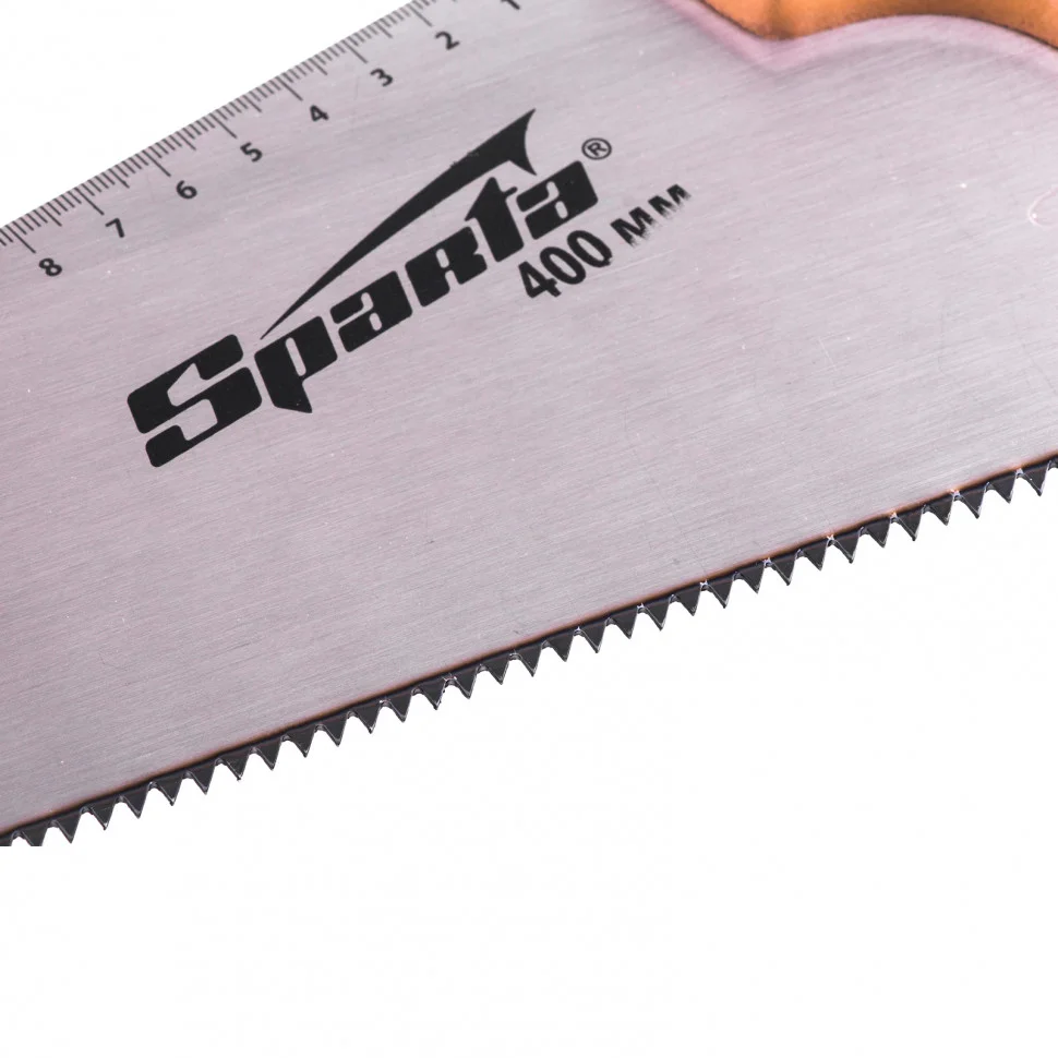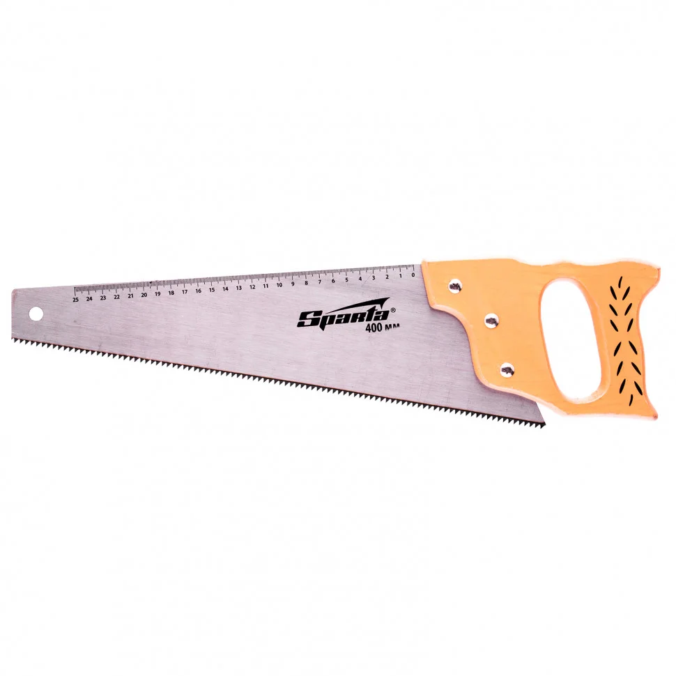Ножовка по дереву Sparta 231855 с полотном длиной 400 мм, с калеными зубьями с шагом 7-8 TPI, с линейкой и деревянной рукояткой, предназначена для продольно-поперечного распиливания древесины. Благодаря зубьям с 2D-заточкой подходит для двухстороннего реза. Режущую кромку можно перетачивать. На полотно нанесена измерительная шкала, позволяющая производить замеры, не тратя время на поиск линейки. Ножовка используется в столярном и плотницком деле, а также полезна дома и на даче.ПреимуществаПрочность — полотно изготовлено из пружинной холоднокатаной стали 65Mn, характеризующейся стойкостью к постоянным нагрузкам.Высокий ресурс — зубья закалены до твердости 55 HRC и хорошо держат заточку.Производительность — крупные зубья с шагом 7-8 TPI обеспечивают быстрый рез.Устойчивость к коррозии — на полотно нанесено защитное лаковое покрытие.Надежность — полотно крепко зафиксировано в рукоятке при помощи винтов.Комфорт во время работы — рукоятка выполнена из дерева и покрыта лаком для защиты от рассыхания и разбухания.