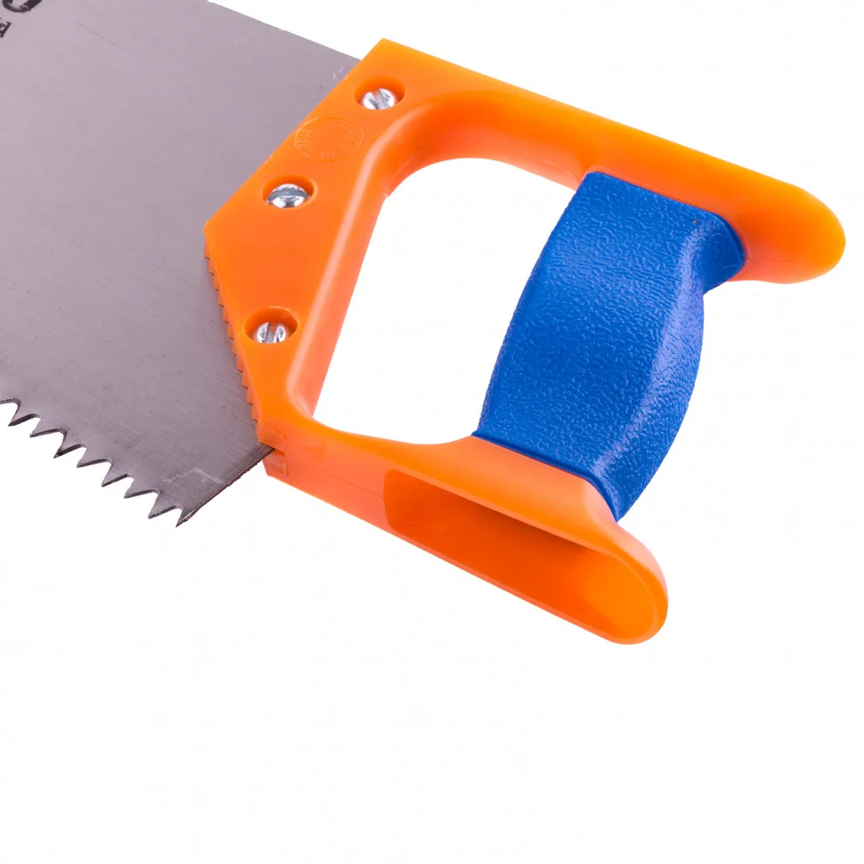 Ножовка по дереву 23165 с длиной полотна 500 мм и пластиковой рукояткой — режущий инструмент, шаг зубьев которого составляет 6,5 мм. Применяется для продольно-поперечного пиления древесины. Пилит в направлении от себя и на себя. Крупные зубья обеспечивают быстрый рез. Если режущая кромка затупится, ее можно заточить. Пила будет полезна столярам и плотникам, пригодится также дома или на даче.ПреимуществаПолотно из холоднокатаной пружинной стали 65Г обладает прочностью и деформационной стойкостью.Закаленные зубья обеспечивают инструменту высокий рабочий ресурс.Лаковое покрытие защищает пилу от коррозии.Зафиксированное 3 винтами полотно не выпадает из рукоятки.Эргономичная пластиковая рукоятка удобно лежит в руке.