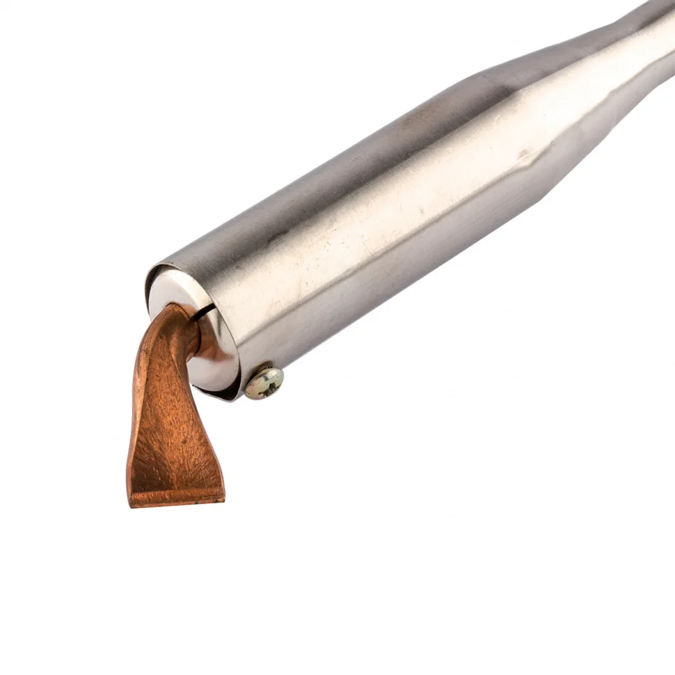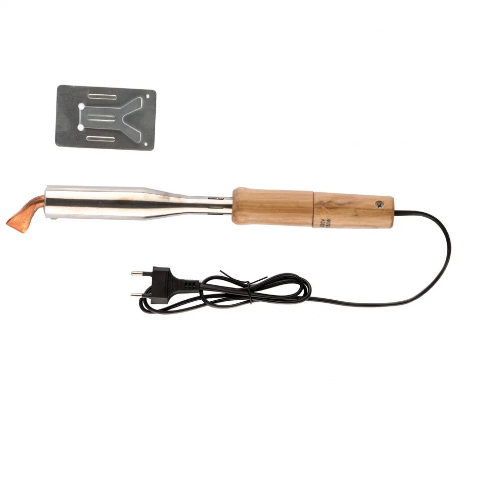 Паяльник электрика Sparta 913105, 150 Вт, 220 В, с ручкой из дерева, применяется для пайки толстых кабелей и крупных деталей. С этими задачами прибор успешно справляется благодаря жалу в форме лопатки. Наконечник съемный, поэтому при необходимости его легко заменить. Нихромовая спираль, являющаяся нагревательным элементом, устойчива к повреждениям, что обеспечивает надежность и долговечность прибора. Паяльник будет полезен для проведения электромонтажных работ.ПреимуществаМедное жало разогревается быстро и чистится легко, поэтому паяльник удобен в использовании.Деревянная рукоятка слабо нагревается и не деформируется, что продлевает срок службы инструмента.Рукоятка из древесины комфортно лежит в руке, поэтому длительное паяние не вызывает дискомфорт.Прибор комплектуется подставкой, на которой его удобно размещать во время работы.