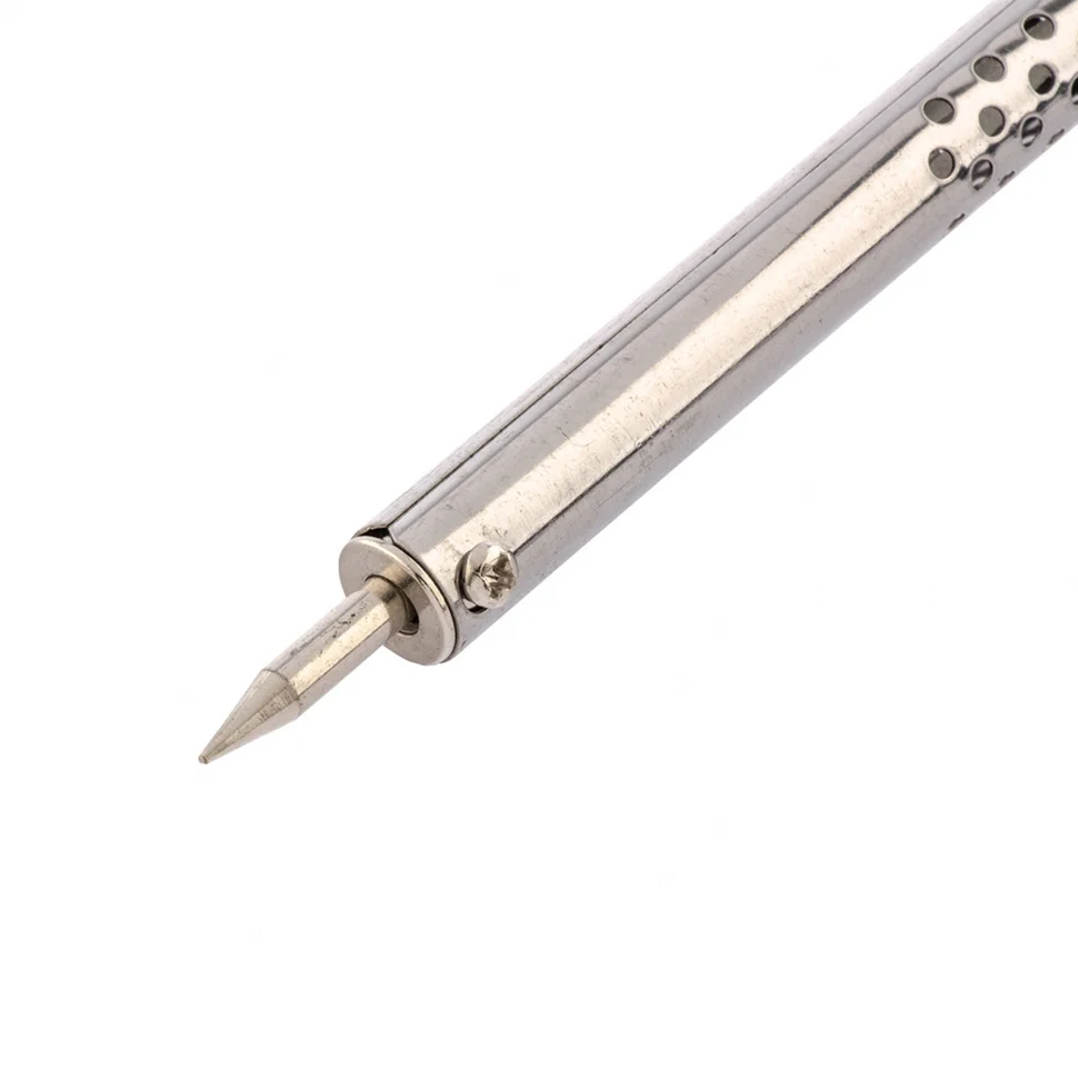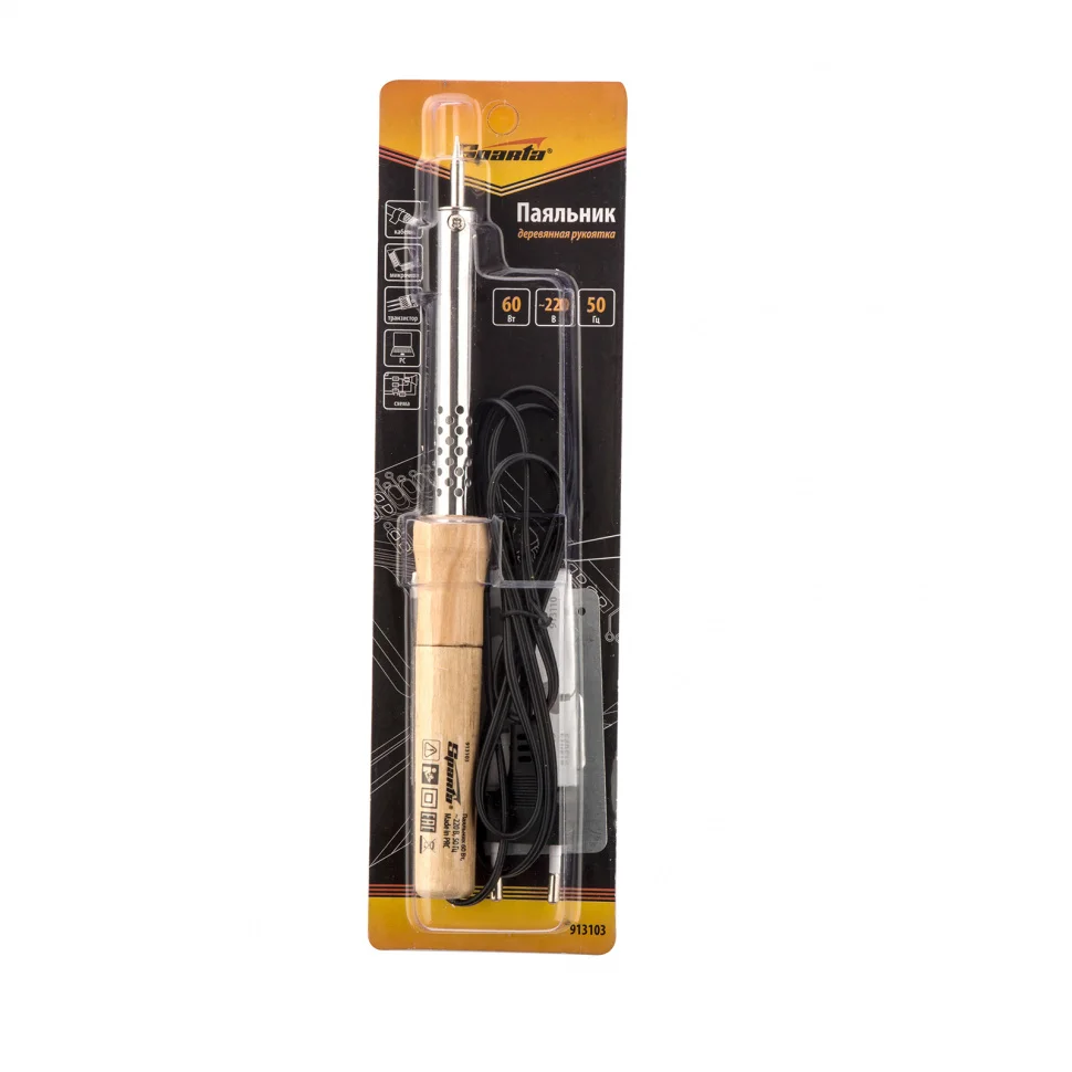 Паяльник Sparta 913103, 60 Вт, 220 В, с ручкой из дерева, используется для пайки электропроводки, микрочипов, электрических схем и транзисторов. Нагревательным элементом является нихромовая спираль, что уменьшает вероятность поломки прибора в результате падения или удара. Конусовидный наконечник позволяет успешно решать поставленные задачи. Жало легко очищается, а в случае выхода из строя его легко можно заменить. Защитное покрытие улучшает прилипание припоя и защищает наконечник от коррозии. Паяльник пригодится для ремонта электроники, бытовой техники, а также обслуживания автомобилей и проведения электромонтажных работ.ПреимуществаМедное жало быстро разогревается, поэтому прибор не требует длительной подготовки к работе.Материал рукоятки — древесина с низкой теплопроводностью, поэтому она меньше нагревается по сравнению с пластиковыми.Деревянная рукоятка удобно лежит в руке, обеспечивая комфорт при длительной работе.В комплект входит подставка для размещения на ней прибора во время работы.