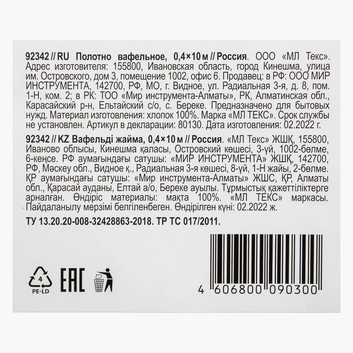 Полотно вафельное 92342 0,4 х 10 м эффективно справляется с уборкой влаги и загрязнений. Можно использовать при строительно-монтажных работах, ремонте различных механизмов, в клининговых компаниях для уборки помещений, обтирании оргтехники, автомобильных деталей и поверхностей автотранспортных средств, при изготовлении стекол и зеркал, в медицинской индустрии, в общественных учреждениях и сфере общепита. Мягкая ткань качественно очищает поверхности, не оставляя следов и царапин.ПреимуществаПолотно выполнено из хлопка и удаляет любые загрязнения.Повышенная впитываемость обеспечивает качественную уборку без разводов и отпечатков, это позволяет чистить смесители, зеркала, мебель на кухне.