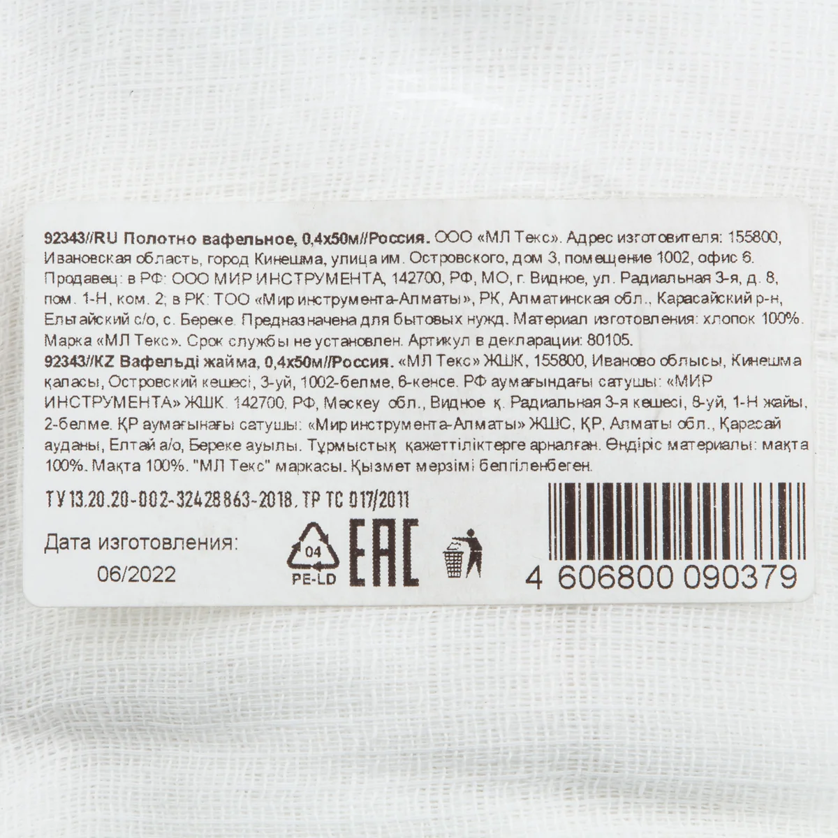 Полотно вафельное 92343 0,4 х 50 м эффективно справляется с уборкой влаги и загрязнений. Можно использовать при строительно-монтажных работах, ремонте различных механизмов, в клининговых компаниях для уборки помещений, обтирании оргтехники, автомобильных деталей и поверхностей автотранспортных средств, при изготовлении стекол и зеркал, в медицинской индустрии, в общественных учреждениях и сфере общепита. Мягкая ткань качественно очищает поверхности, не оставляя следов и царапин.ПреимуществаПолотно выполнено из хлопка и удаляет любые загрязнения. Повышенная впитываемость обеспечивает качественную уборку без разводов и отпечатков, это позволяет чистить смесители, зеркала, мебель на кухне.