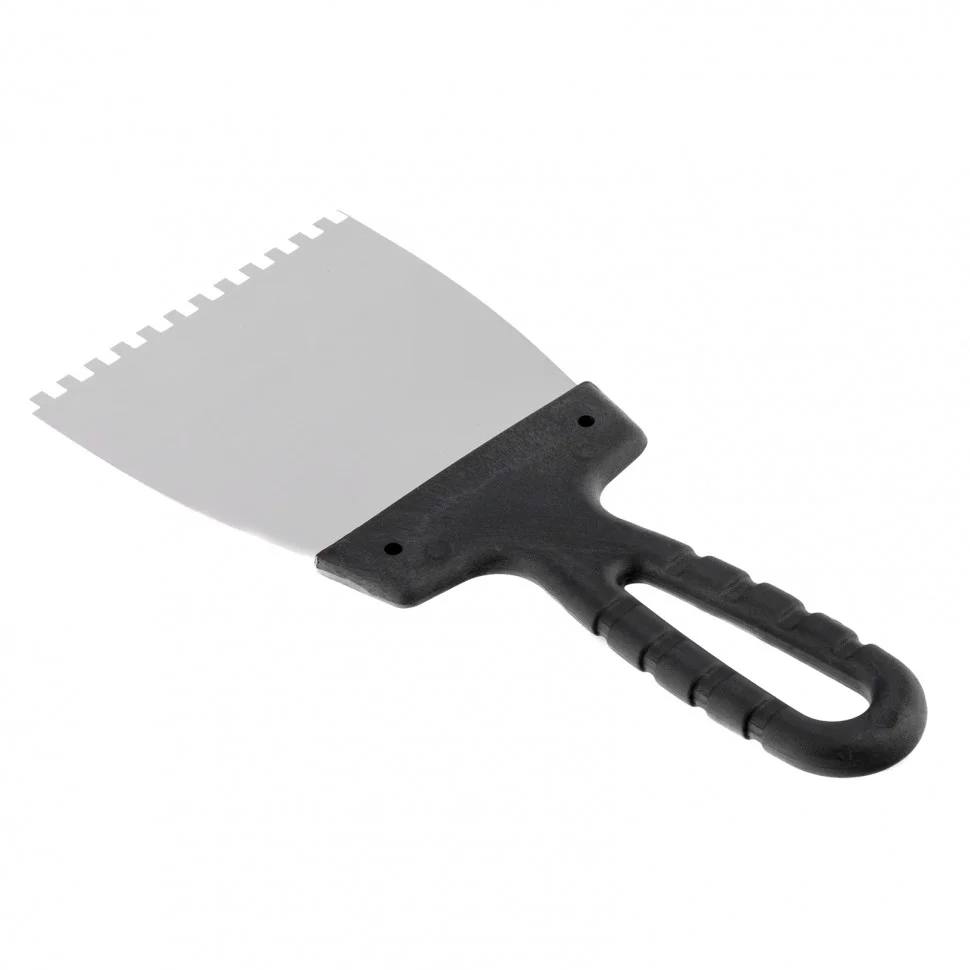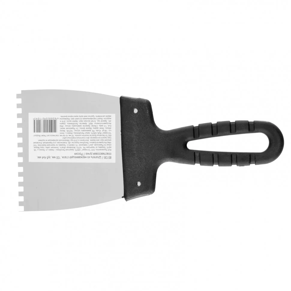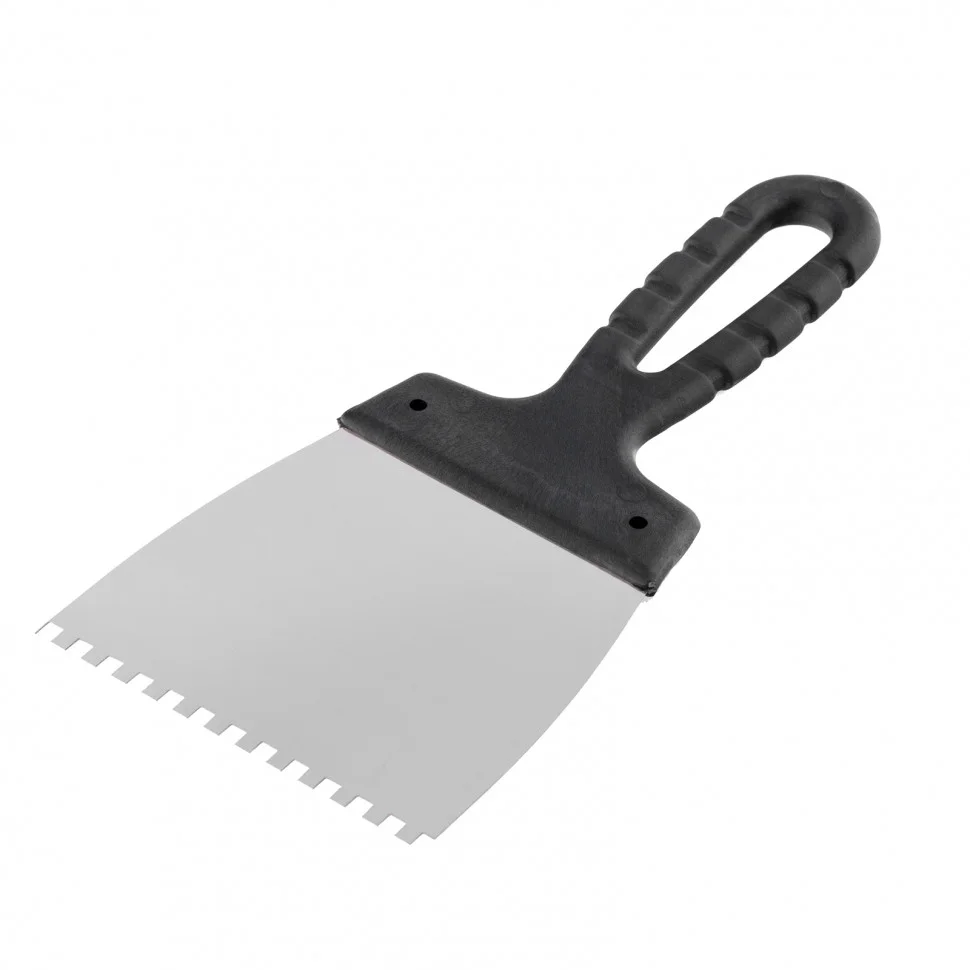 Шпатель Sparta 85138 шириной 100 мм, из нержавеющей стали, с пластмассовой ручкой и зубьями 4 х 4 мм, применяется для равномерного нанесения клея при укладке мелкоформатной плитки, мозаики и т.д. Квадратные зубья облегчают нанесение клеевого состава, позволяя ровно и экономно распределять его по поверхности. Зубья размером 4 х 4 мм рассчитаны на плитку площадью 50-100 см2.ПреимуществаУпругое полотно — при изгибающих нагрузках шпатель быстро восстанавливает свою форму.Коррозионная стойкость — рабочее полотно выполнено из нержавеющей стали.Надежный хват — инструмент имеет эргономичную рельефную ручку.Удобство — рукоятка выполнена с небольшим наклоном для комфортного нанесения и выравнивания растворов.Практичное хранение — в рукоятке предусмотрено отверстие для подвешивания шпателя.