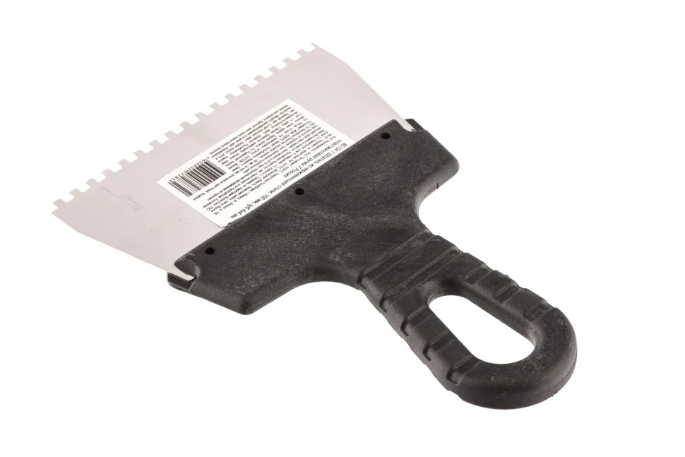 Шпатель Sparta 85154 шириной 150 мм, из нержавеющей стали, с пластмассовой ручкой и зубьями 4 х 4 мм, применяется для равномерного нанесения клея при укладке мелкоформатной плитки, мозаики и т.д. Квадратные зубья облегчают нанесение клеевого состава, позволяя ровно и экономно распределять его по поверхности. Зубья размером 4 х 4 мм рассчитаны на плитку площадью 50-100 см2.ПреимуществаУпругое полотно — при изгибающих нагрузках шпатель быстро восстанавливает свою форму.Коррозионная стойкость — рабочее полотно выполнено из нержавеющей стали.Надежный хват — инструмент имеет эргономичную рельефную ручку.Удобство — рукоятка выполнена с небольшим наклоном для комфортного нанесения и выравнивания растворов.Практичное хранение — в рукоятке предусмотрено отверстие для подвешивания шпателя.