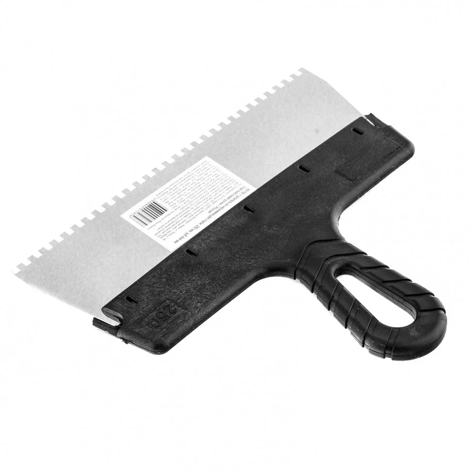 Шпатель Sparta 85156 шириной 250 мм, из нержавеющей стали, с пластмассовой ручкой и зубьями 4 х 4 мм, применяется для равномерного нанесения клея при укладке мелкоформатной плитки, мозаики и т.д. Квадратные зубья облегчают нанесение клеевого состава, позволяя ровно и экономно распределять его по поверхности. Зубья размером 4 х 4 мм рассчитаны на плитку площадью 50-100 см2.ПреимуществаУпругое полотно — при изгибающих нагрузках шпатель быстро восстанавливает свою форму.Коррозионная стойкость — рабочее полотно выполнено из нержавеющей стали.Надежный хват — инструмент имеет эргономичную рельефную ручку.Удобство — рукоятка выполнена с небольшим наклоном для комфортного нанесения и выравнивания растворов.Практичное хранение — в рукоятке предусмотрено отверстие для подвешивания шпателя.