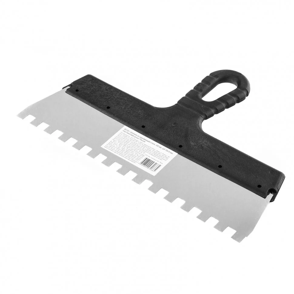 Шпатель Sparta 85130 шириной 300 мм, из нержавеющей стали, с пластмассовой ручкой и зубьями 10 х 10 мм, применяется для равномерного нанесения клея при укладке мелкоформатной плитки, мозаики и т.д. Квадратные зубья облегчают нанесение клеевого состава, позволяя ровно и экономно распределять его по поверхности. Зубья размером 10 х 10 мм рассчитаны на плитку площадью 900-2500 см2.ПреимуществаУпругое полотно — при изгибающих нагрузках шпатель быстро восстанавливает свою форму.Коррозионная стойкость — рабочее полотно выполнено из нержавеющей стали.Надежный хват — инструмент имеет эргономичную рельефную ручку.Удобство — рукоятка выполнена с небольшим наклоном для комфортного нанесения и выравнивания растворов.Практичное хранение — в рукоятке предусмотрено отверстие для подвешивания шпателя.