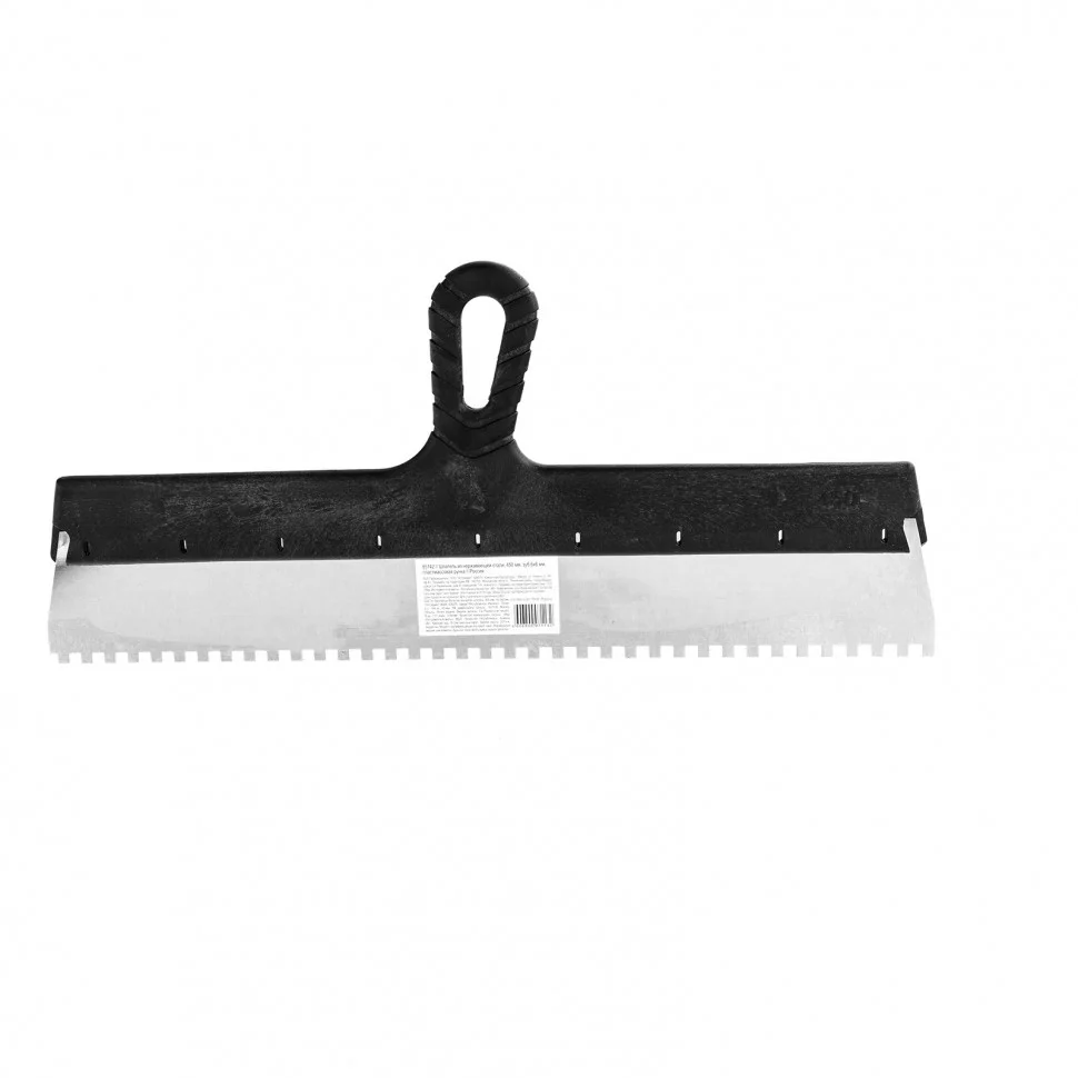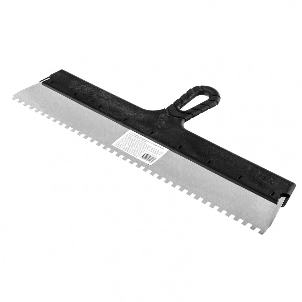 Шпатель Sparta 85142 шириной 450 мм, из нержавеющей стали, с пластмассовой ручкой и зубьями 6 х 6 мм, применяется для равномерного нанесения клея при укладке мелкоформатной плитки, мозаики и т.д. Квадратные зубья облегчают нанесение клеевого состава, позволяя ровно и экономно распределять его по поверхности. Зубья размером 6 х 6 мм рассчитаны на плитку площадью 100-400 см2.ПреимуществаУпругое полотно — при изгибающих нагрузках шпатель быстро восстанавливает свою форму.Коррозионная стойкость — рабочее полотно выполнено из нержавеющей стали.Надежный хват — инструмент имеет эргономичную рельефную ручку.Удобство — рукоятка выполнена с небольшим наклоном для комфортного нанесения и выравнивания растворов.Практичное хранение — в рукоятке предусмотрено отверстие для подвешивания шпателя.