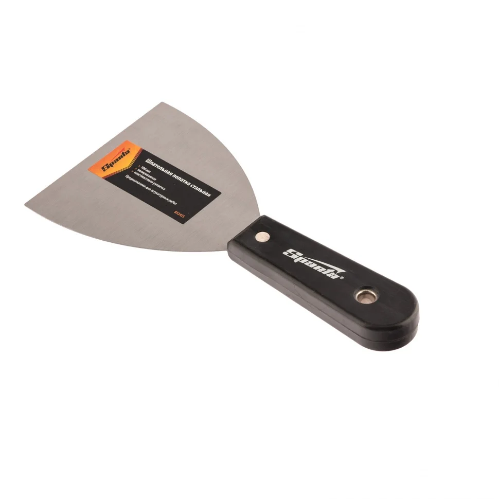 Стальная шпательная лопатка Sparta 852425 шириной 100 мм, полированная, с пластмассовой ручкой, станет незаменимым помощником при проведении строительных и ремонтных работ. Пригодится мастерам для нанесения, выравнивания и сглаживания различных клеевых и строительных растворов.ПреимуществаОдна лопатка для разных задач — за счет острого края полотном удобно удалять с поверхностей следы ржавчины.Коррозионная стойкость — рабочая часть покрыта защитным бесцветным лаком.Прочность и долговечность — полотно выполнено из углеродистой стали и надежно скреплено с рукояткой.Качественная работа — полотно отполировано, поэтому к нему не прилипает раствор, а обрабатываемая поверхность получается идеально гладкой.Небольшая ширина 10 см — шпателем удобно работать в труднодоступных местах.Комфортная работа — легкая пластиковая рукоятка удобно ложится в руку.Практичное хранение — в рукоятке имеется отверстие для подвешивания.