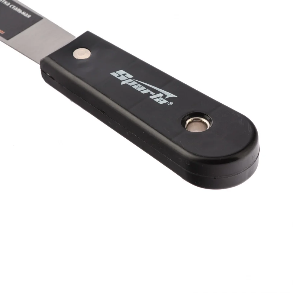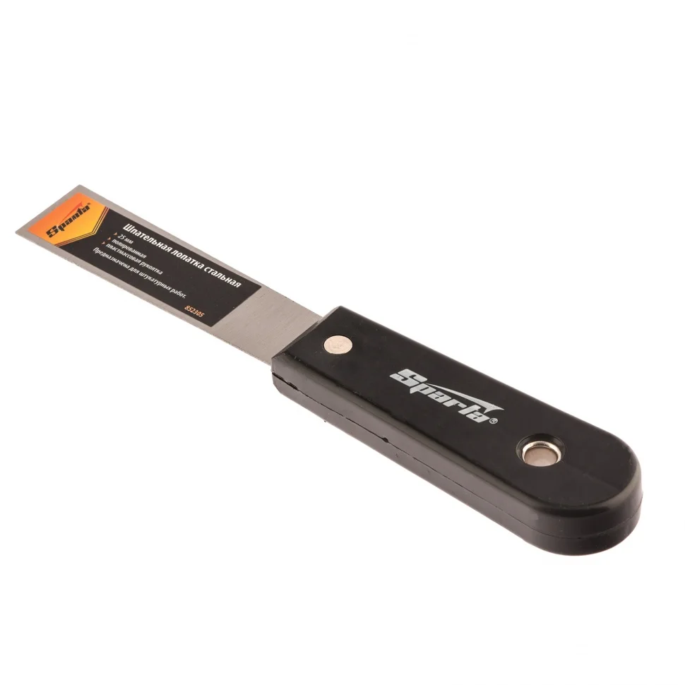 Стальная шпательная лопатка Sparta 852305 шириной 25 мм, полированная, с пластмассовой ручкой, станет незаменимым помощником при проведении строительных и ремонтных работ. Пригодится мастерам для нанесения, выравнивания и сглаживания различных клеевых и строительных растворов.ПреимуществаОдна лопатка для разных задач — за счет острого края полотном удобно удалять с поверхностей следы ржавчины.Коррозионная стойкость — рабочая часть покрыта защитным бесцветным лаком.Прочность и долговечность — полотно выполнено из углеродистой стали и надежно скреплено с рукояткой.Качественная работа — полотно отполировано, поэтому к нему не прилипает раствор, а обрабатываемая поверхность получается идеально гладкой.Небольшая ширина 2,5 см — шпателем удобно работать в узких и труднодоступных местах.Комфортная работа — легкая пластиковая рукоятка удобно ложится в руку.Практичное хранение — в рукоятке имеется отверстие для подвешивания.