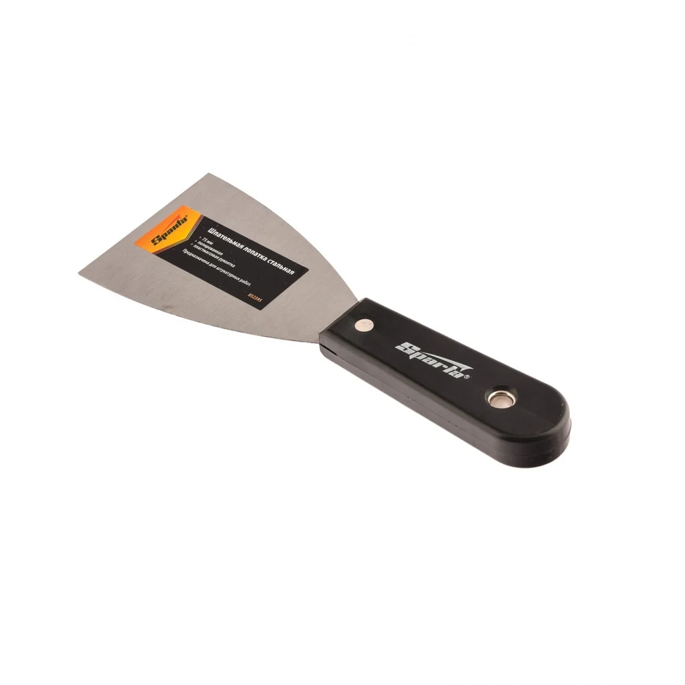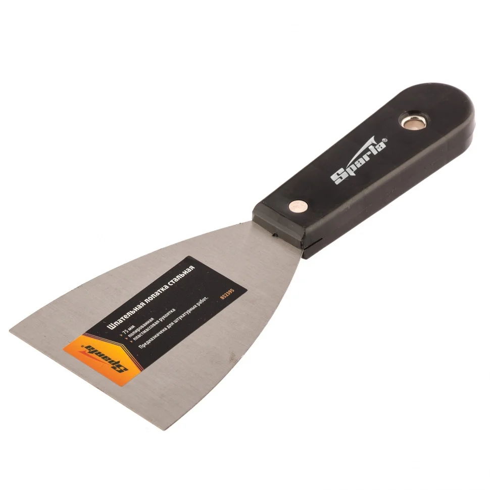 Стальная шпательная лопатка Sparta 852395 шириной 75 мм, полированная, с пластмассовой ручкой, станет незаменимым помощником при проведении строительных и ремонтных работ. Пригодится мастерам для нанесения, выравнивания и сглаживания различных клеевых и строительных растворов.ПреимуществаОдна лопатка для разных задач — за счет острого края полотном удобно удалять с поверхностей следы ржавчины.Коррозионная стойкость — рабочая часть покрыта защитным бесцветным лаком.Прочность и долговечность — полотно выполнено из углеродистой стали и надежно скреплено с рукояткой.Качественная работа — полотно отполировано, поэтому к нему не прилипает раствор, а обрабатываемая поверхность получается идеально гладкой.Небольшая ширина 7,5 см — шпателем удобно работать в труднодоступных местах.Комфортная работа — легкая пластиковая рукоятка удобно ложится в руку.Практичное хранение — в рукоятке имеется отверстие для подвешивания.
