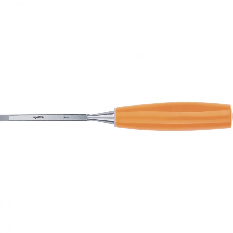 Плоская стамеска Sparta 244055 с шириной лопасти 6 мм и пластиковой рукояткой предназначена для тонких работ по дереву. Она позволяет зачищать пазы и кромки, снимать фаски, вырезать небольшие прямоугольные углубления. Стамеска применяется в столярном деле, мебельном производстве, а также будет полезна в быту.ПреимуществаПолотно выполнено из качественной конструкционной углеродистой стали 55, поэтому обладает высокой прочностью и хорошими режущими свойствами.Твердость стамески составляет 50-55 HRC на длине 2/3 рабочей части полотна, что позволяет режущей кромке долго не тупиться.Благодаря заточке на специальном оборудовании под углом 20-35° обеспечивается высокая острота лезвия и точность работ.Прочную пластмассовую рукоятку удобно держать в руке, поэтому работать со стамеской комфортно.Яркий цвет рукоятки не даст стамеске затеряться в рабочем пространстве.