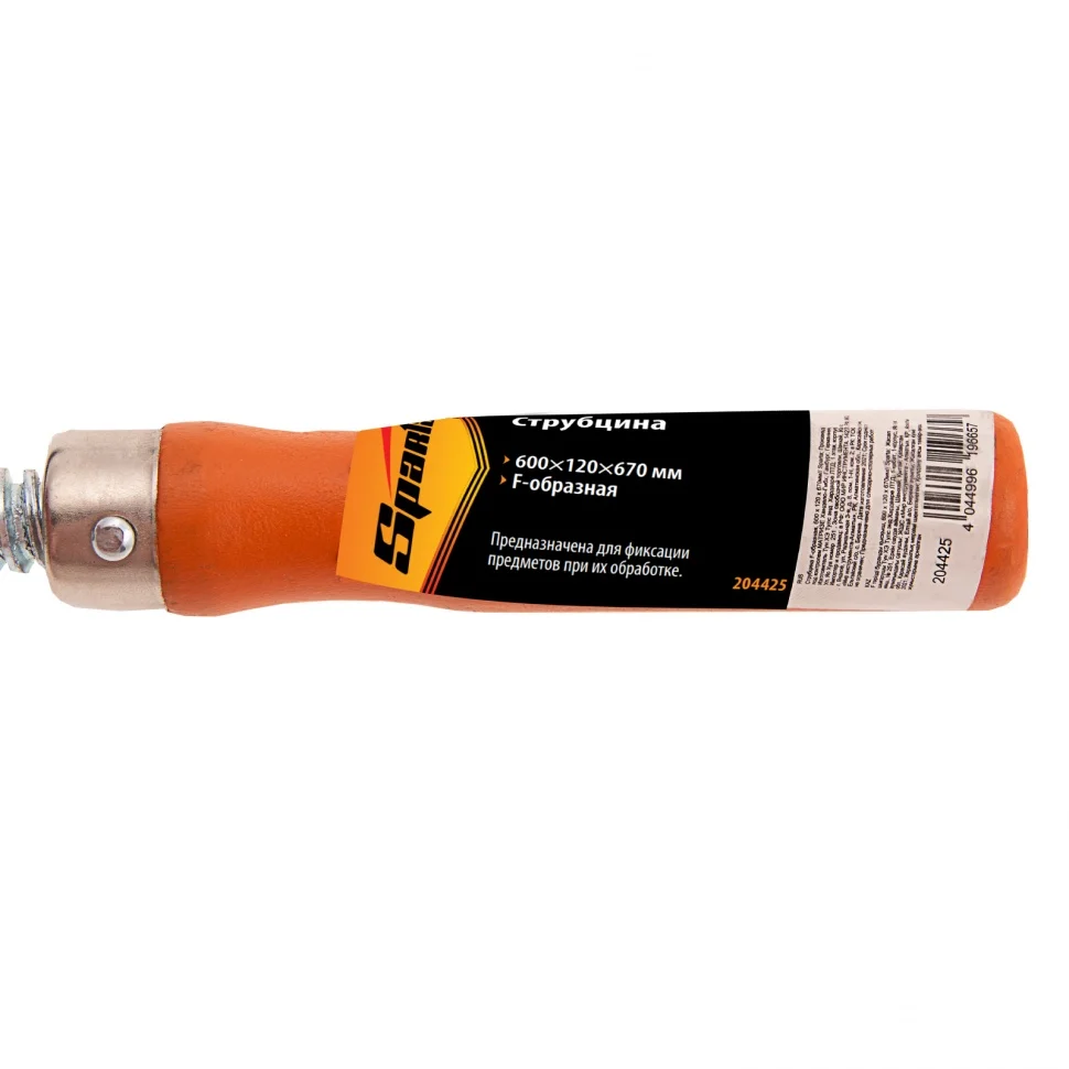 F-образная струбцина Sparta 204425, 600 х 120 х 670мм, используется в столярном и слесарном деле и позволяет фиксировать заготовки из металла, древесины и других материалов для их соединения или обработки. Деталь помещают между губками, одна из которых подвижна и служит для регулировки величины захвата. Винтовой зажим позволяет прикладывать значительное усилие для надежной фиксации. Защитные накладки предотвращают повреждение детали. Элементы конструкции выдерживают высокую температуру, поэтому струбцина подходит для проведения сварочных работ, при этом пластиковые накладки необходимо снять.ПреимуществаШтанга изготовлена из стали, поэтому обладает повышенной устойчивостью к изгибанию и выдерживает значительные нагрузки.Оцинкованный винт устойчив к коррозии, что увеличивает срок службы инструмента.Удобная деревянная рукоятка надежно лежит в руке, что повышает комфортность работы.