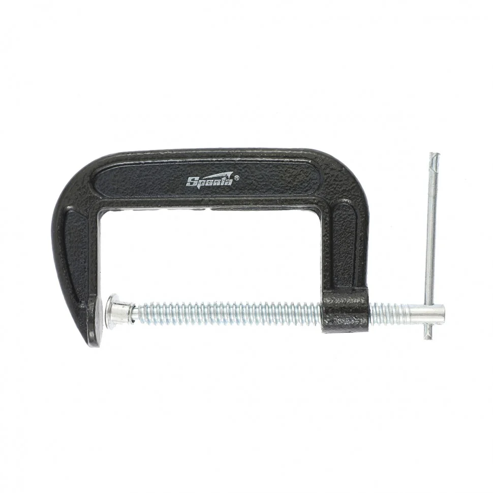 G-образная струбцина Sparta 206565 с шириной зажима 100 мм надежно фиксирует различные детали для склеивания, сверления, пиления, шлифования или сварки. Винт с воротком и крупной червячной резьбой позволяет зажимать детали плавно и со значительным усилием. Струбцина будет полезна домашним мастерам.ПреимуществаЧугунная рама обеспечивает инструменту прочность и устойчивость к нагрузкам.Цветное лаковое покрытие защищает раму от коррозии и механических повреждений.Подвижный зажим обеспечивает надежную фиксацию.
