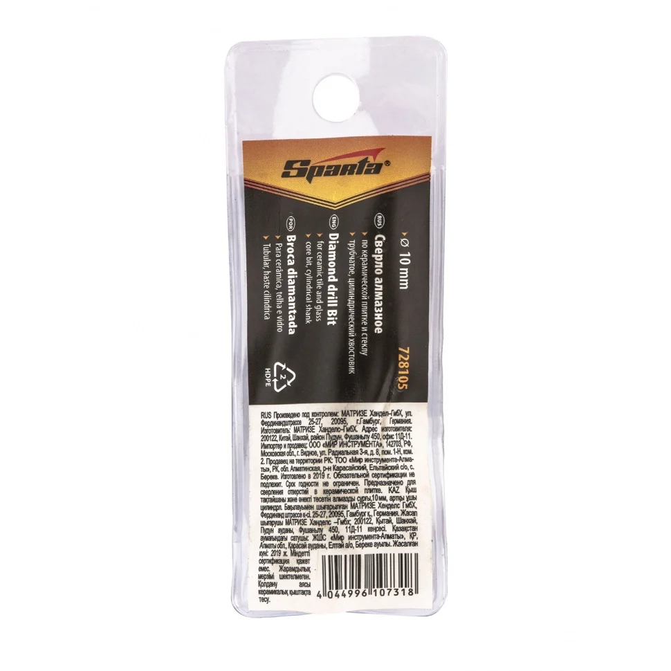 Сверло алмазное по керамической плитке и стеклу Sparta 728105, 10 мм, с цилиндрическим хвостовиком, — недорогой режущий инструмент, предназначенный для бытовых работ. С его помощью можно осуществить точное сверление отверстий в керамической плитке, кафеле и стекле. Сверло является оснасткой для шуруповертов и дрелей и рекомендовано для работы в безударном режиме на рабочих оборотах 350-700 об/мин.ПреимуществаСверло выполнено из стали 45, обладает прочностью и износостойкостью.Антикоррозионное покрытие не допускает разрушения сверла от воздействия воды.Для корректной и длительной работы сверла необходимо использовать водяное охлаждение.Рекомендуется использовать кондуктор 72833 для предотвращения смещения сверла.