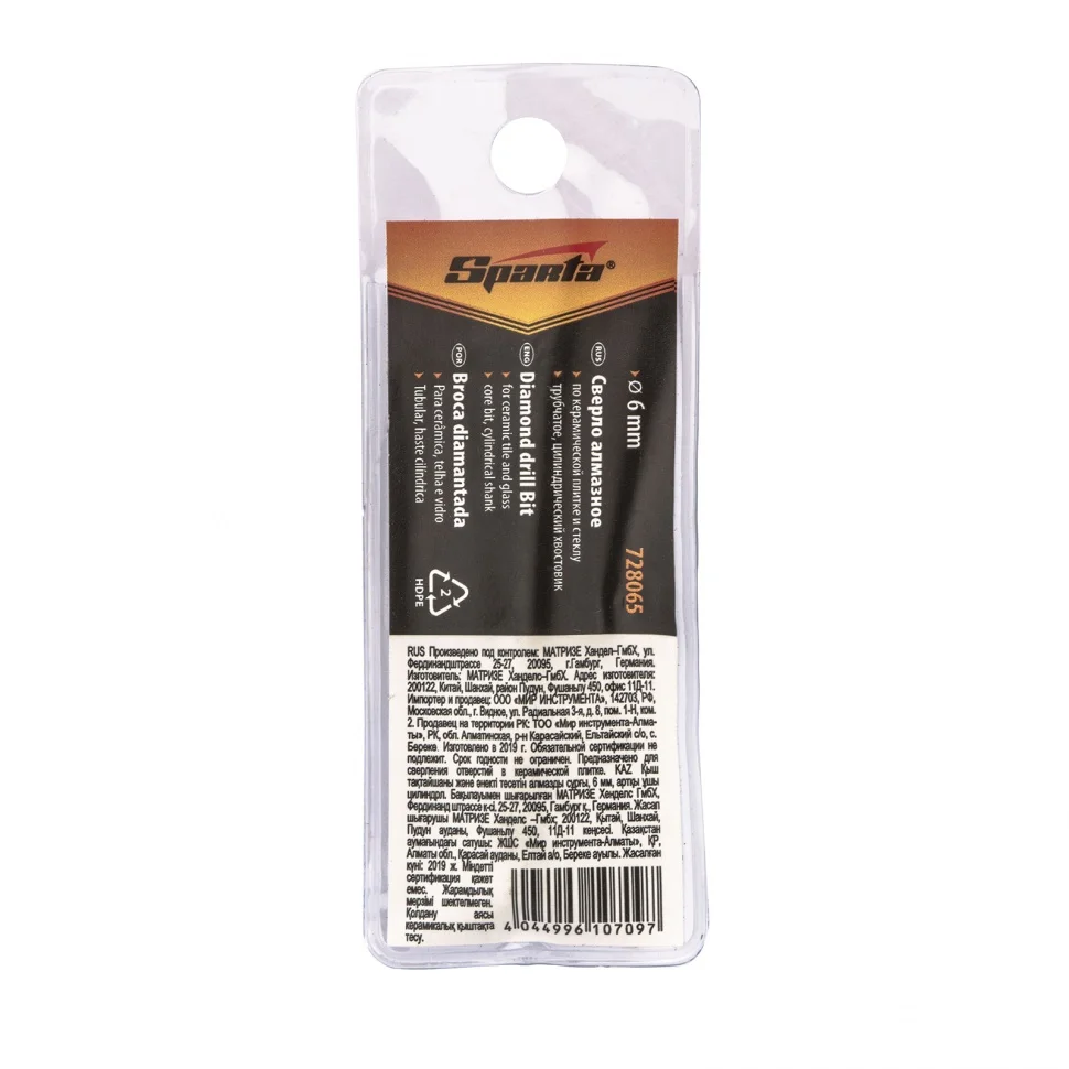 Сверло алмазное по керамической плитке и стеклу, 6 мм, цилиндрический хвостовик Sparta 728065