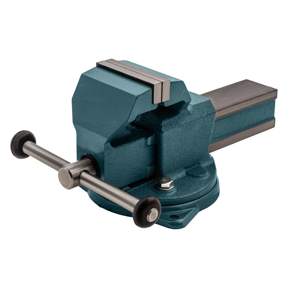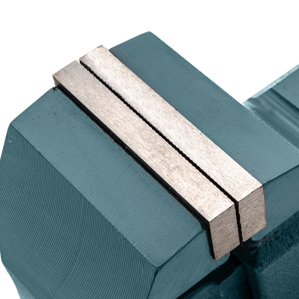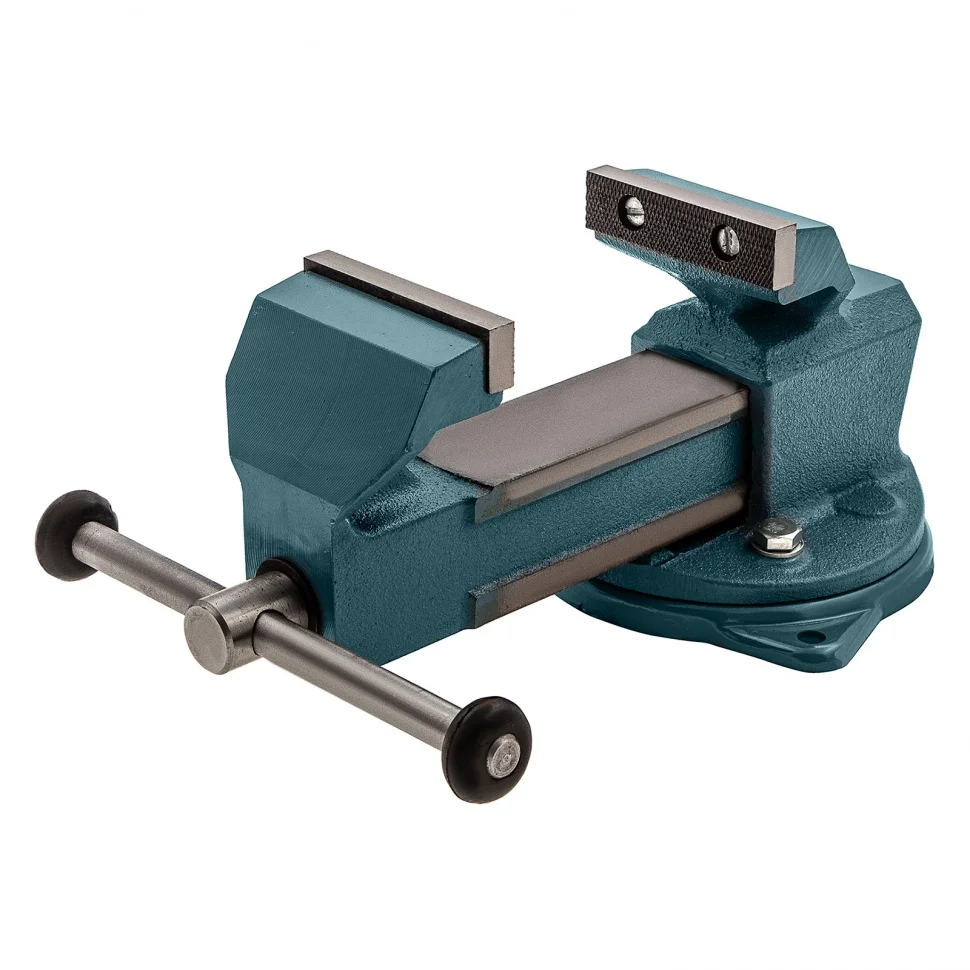 Поворотные слесарные тиски 18663 с губками шириной 100 мм используются для надежной фиксации заготовок. Помогают просверлить отверстия в деталях, выполнить шлифовку и другие столярные и слесарные работы. Тиски с рабочим ходом 140 мм позволяют удерживать крупные заготовки.ПреимуществаВысокий показатель прочности — корпус изготовлен из чугуна ВЧ50, а губки — из стали 50Х.Защита от разрушения — на инструмент нанесено антикоррозийное порошковое покрытие.Рельефная поверхность губок — заготовки надежно фиксируются и не выскальзывают.Поворотная конструкция — удобно обрабатывать детали с разных сторон.Быстрый монтаж — в основании предусмотрены отверстия для крепления к верстаку.