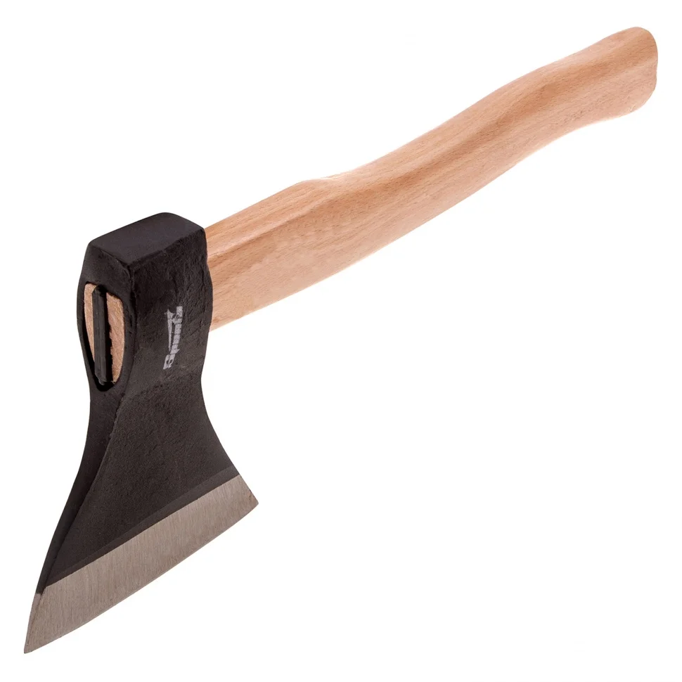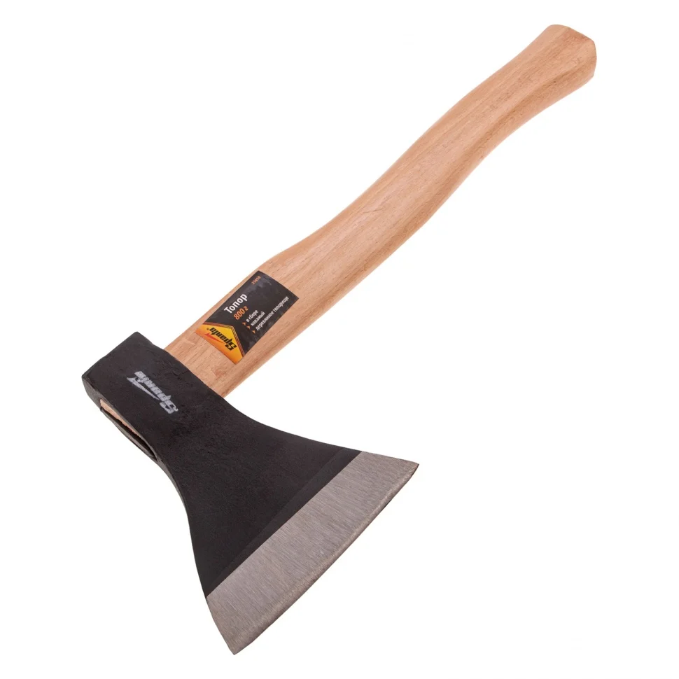 Кованый топор Sparta 21610 с рабочей частью весом 800 г, в сборе с деревянным топорищем, пригодится для решения несложных хозяйственных задач. Им можно рубить ветки, инструмент подходит также для заготовки дров. Полукруглая режущая кромка облегчает выполнение поставленных задач.ПреимуществаТопор изготовлен из стали 45 методом свободной ковки, поэтому обладает необходимыми прочностными характеристиками.Режущая кромка закалена до оптимальной твердости 50 HRC, за счет чего отличается износостойкостью и долго сохраняет остроту.Деревянное топорище покрыто лаком для предотвращения рассыхания.Небольшой вес полотна 800 г снижает усталость в руках при продолжительной работе.Топор компактен за счет небольшой рукоятки длиной 380 мм, поэтому его удобно транспортировать.