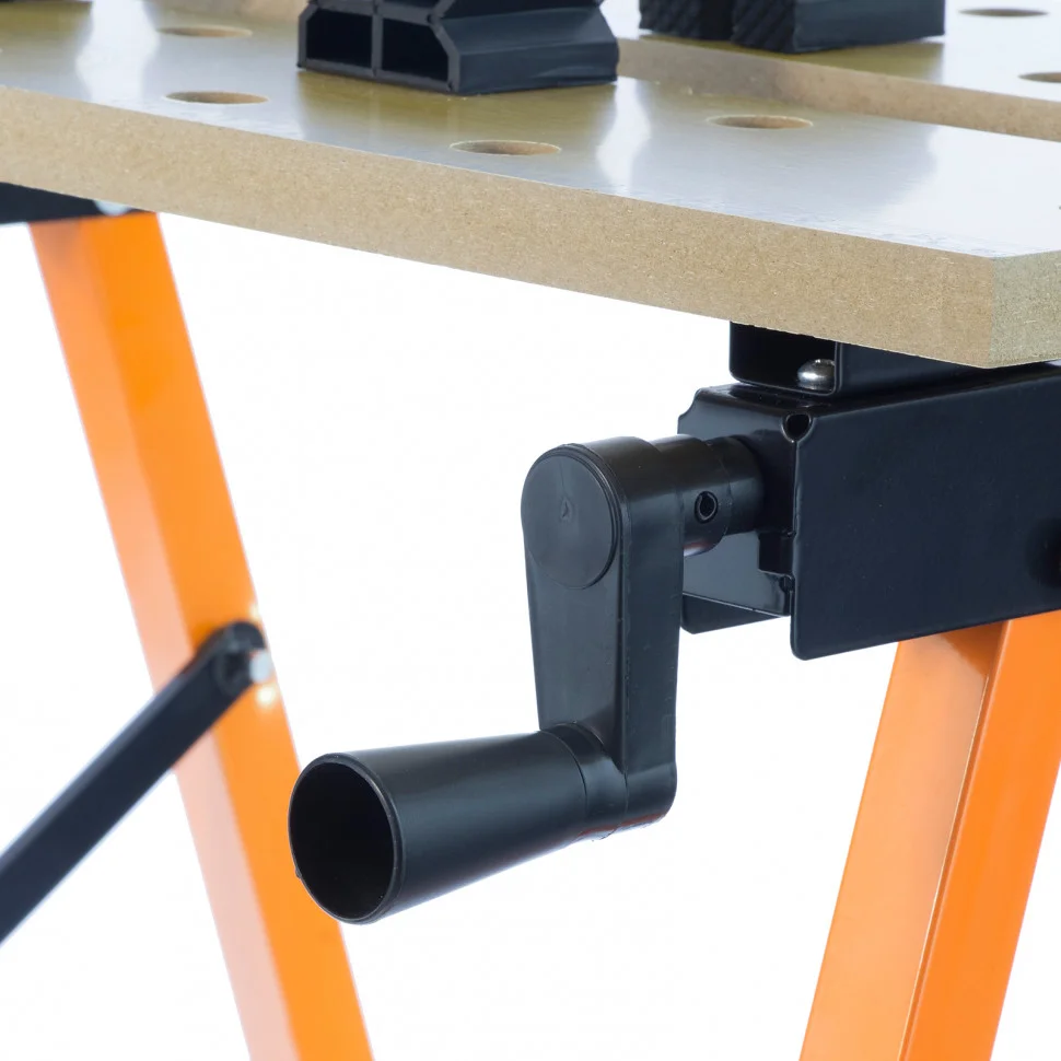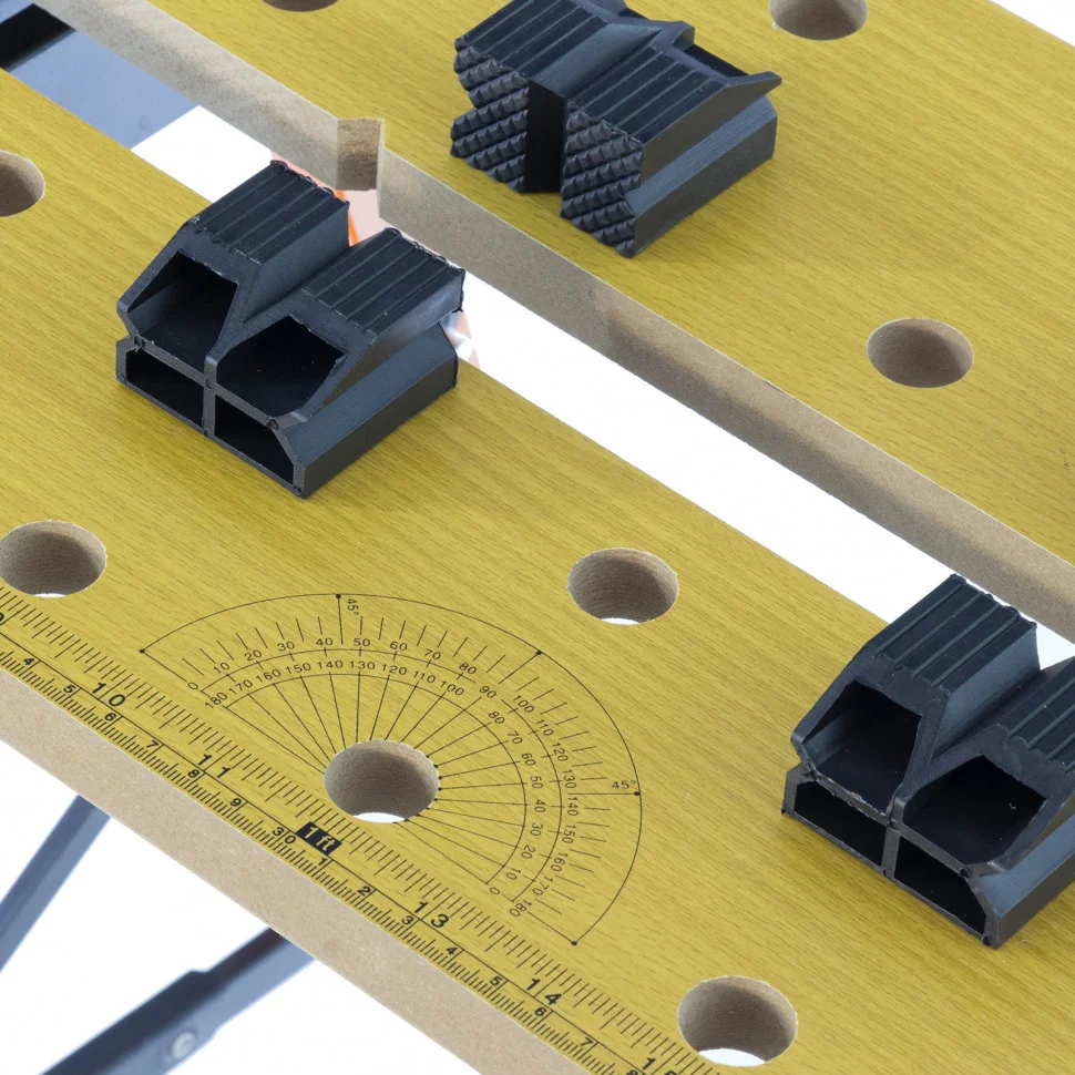 Портативный верстак-тиски Sparta 257055 размером 640 х 520 х 790 мм служит для зажимания заготовок и используется для выполнения столярных и слесарных работ. Столешница верстака представляет собой тиски из двух раздельных блоков, которые позволяют фиксировать даже детали с непараллельными гранями. Верстак пригодится дома и в частной мастерской. Приспособление необходимо устанавливать на ровной поверхности для максимальной устойчивости и исключения травм из-за несоблюдения техники безопасности.ПреимуществаНадежная конструкция — верстак-тиски выдерживает нагрузку до 100 кг.Удобная эксплуатация — верстак снабжен 4 съемными упорами, которые устанавливаются в различных позициях, а на столешнице имеется разметка с линейкой и транспортиром.Работа с заготовками сложной формы — на столешнице предусмотрено 24 отверстия под упоры.Возможность установки на любой ровной поверхности — на ножках имеются специальные накладки, не скользящие и не повреждающие напольное покрытие.Компактность — в сложенном виде приспособление занимает мало места, его можно хранить без снятия элементов конструкции.