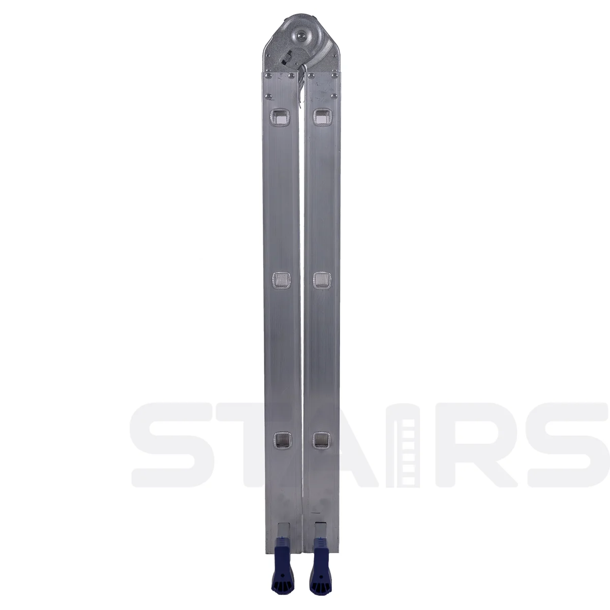 Лестница состоит из двух секций, соединенных шарнирами. Лестница трансформируется в приставную со стабилизатором или двухстороннюю стремянку. Алюминиевый сплав делает лестницу легкой, но при этом прочной за счет увеличенной изностойкости материала. Алюминий не подвержен коррозии, что позволяет использовать лестницу как в помещении, так и на открытом пространстве.