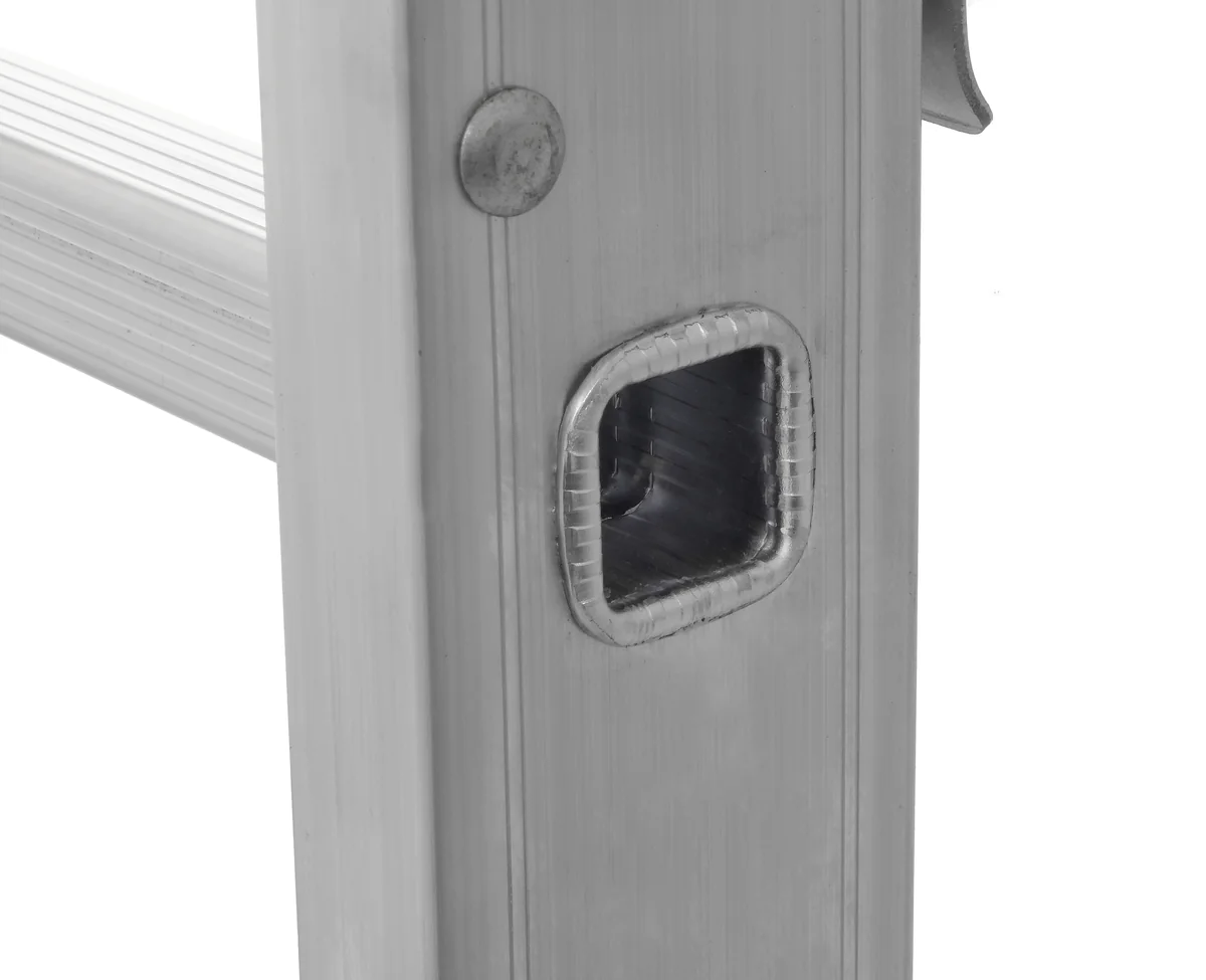 Лестница из трех секций обладает наибольшей рабочей высотой. Лестница может служить раздвижной, двухсекционной, стремянкой с выдвижной секцией, и отдельной приставной лестницей, так как верхняя секция легко вынимается. Алюминиевый сплав делает лестницу легкой, но при этом прочной за счет увеличенной изностойкости материала. Алюминий не подвержен коррозии, что позволяет использовать лестницу как в помещении, так и на открытом пространстве.