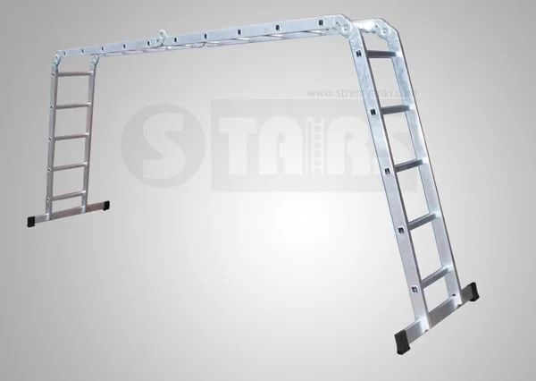 Шарнирные соединения превращают лестницу трансформер в двухстороннюю стремянку, помост или лестницу с консолью (упор в стену, напоминающий букве "Г"). Лестницы-трансформеры отлично зарекомендовали себя при проведении строительных работ (монтажных, отделочных и т.п.) в различных условиях. Так же её удобно использовать на складах, благодаря небольшим габаритам. Компактная конструкция лестниц-трансформеров не требует много места, они легко складываются гармошкой, и могут поместиться в багажнике автомобиля или в шкафу. Рекомендуемая нагрузка 150 кг