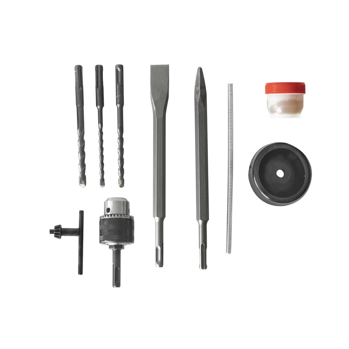 - РАСШИРЕННАЯ КОМПЛЕКТАЦИЯ: Глубиномер,дополнительная рукоятка, ключ патрона, ключевой патрон с переходником, пыльник, емкость со смазкой, бур-3 шт., пика, долото, пластиковый кейс