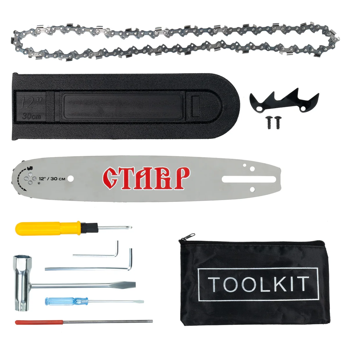 - КОМПЛЕКТАЦИЯ: Емкость для приготовления смеси, зубчатый упор, ключ шестигранный Г-образный, ключ свечной, напильник, отвертка, цепь, шина, защитный кожух шины, сумка для инструмента.
