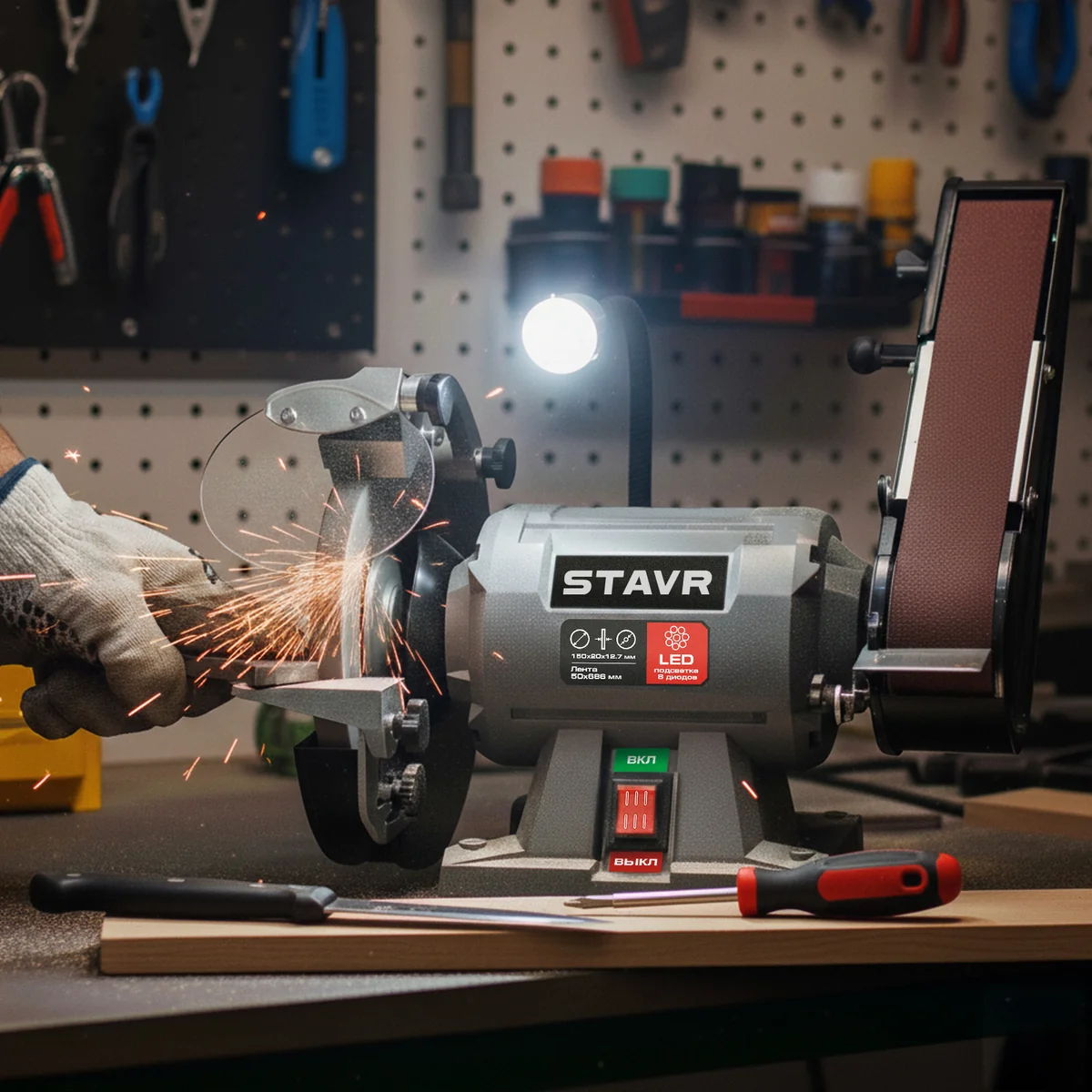 Комплектация: станок, заточной круг 150х20х12,7 мм (60), шлифовальная лента 50х686 мм (80, 100), защитный экран с креплением, рабочая площадка с креплением, руководство по эксплуатации.