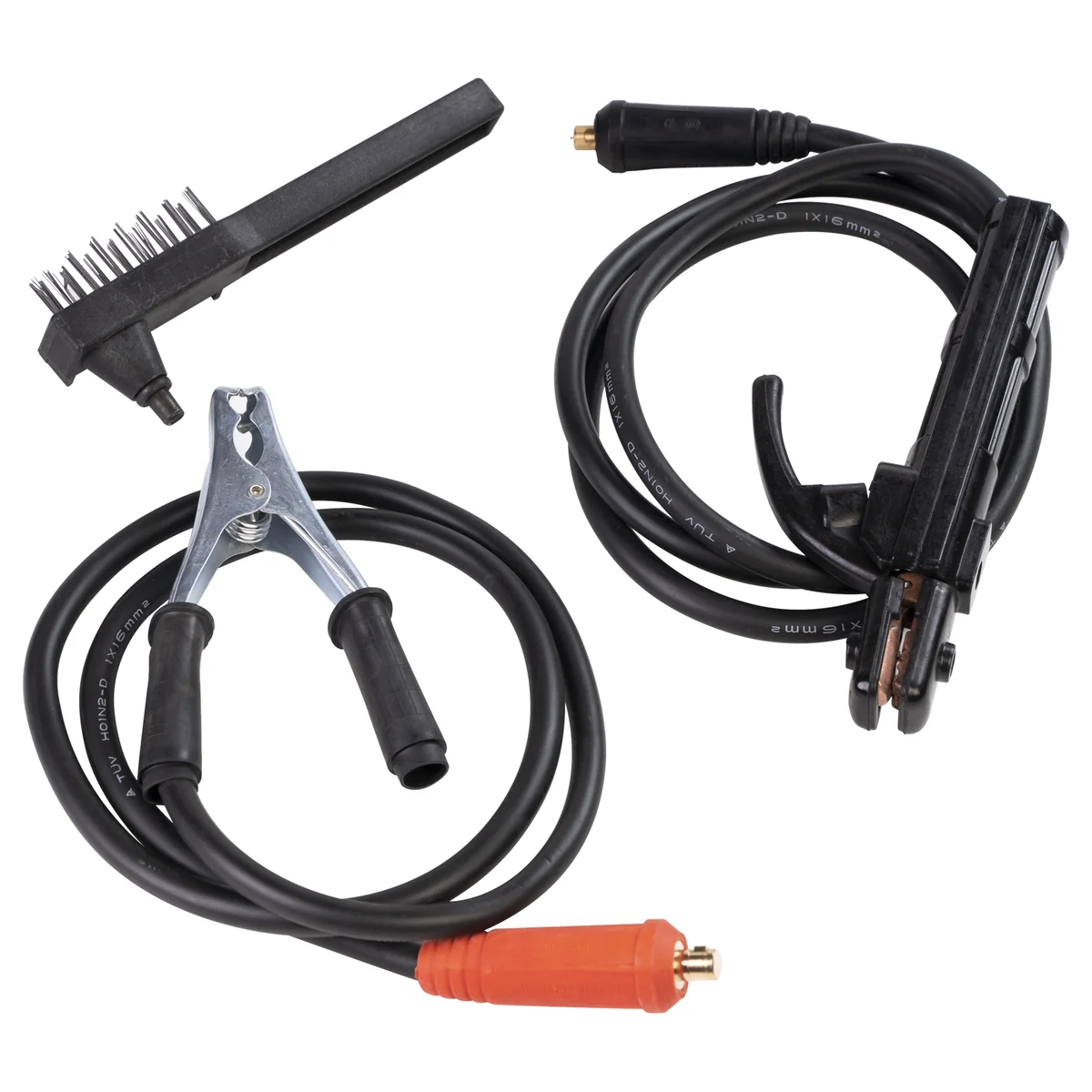- КОМПЛЕКТАЦИЯ - Рабочий кабель с электрододержателем, кабель заземления с клеммой, металлическая щетка, наплечный ремень.