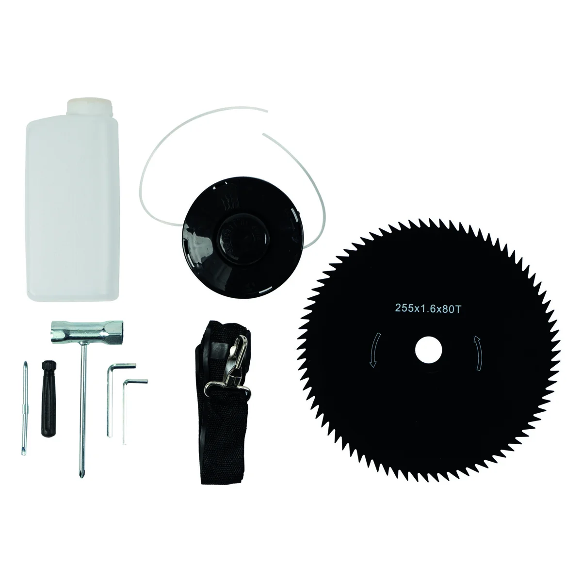 - КОМПЛЕКТАЦИЯ: емкость для приготовления смеси, плечевой ремень, ключ шестигранный Г-образный (2 шт), ключ свечной, ключ рожковый, отвертка, набор крепежа, катушка с леской, нож.