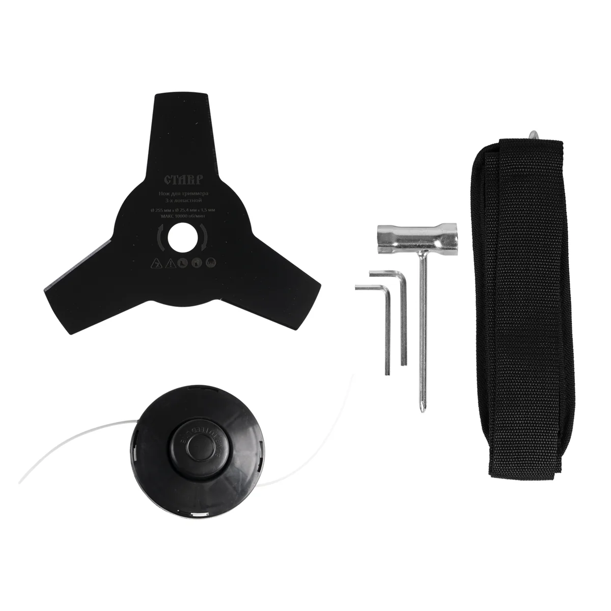 - КОМПЛЕКТАЦИЯ: плечевой ремень (2 шт), ключ шестигранный Г-образный, ключ свечной, катушка с леской, нож