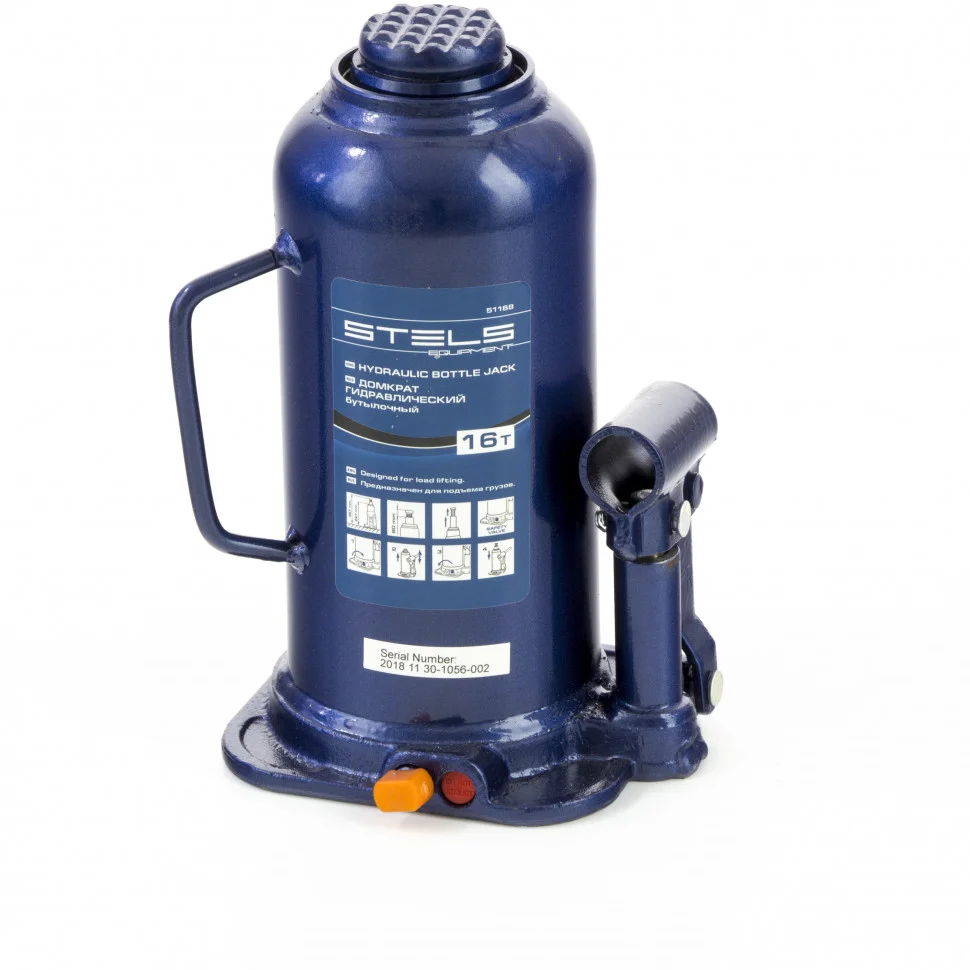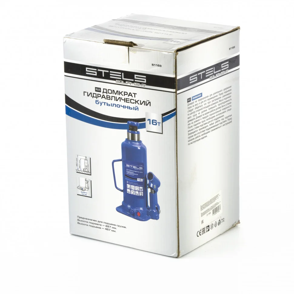 Гидравлический бутылочный домкрат Stels 51168 применяется для быстрого поднятия грузов весом до 16 т на высоту до 457 мм. Он оптимален для авто с большим клиренсом, т.к. минимальная высота подхвата составляет 227 мм. Домкрат будет полезен автолюбителям и профессионалам при проведении ремонта авто.ПреимуществаДомкрат не поднимает грузы тяжелее 16 тонн, т.к. оснащен клапаном безопасности.Коррозионностойкая сталь повышенной прочности гарантирует надежность и долговечность корпуса.Домкрат не имеет резьбовых соединений, ослабляющих его конструкцию, т.к. корпус приварен к станине.