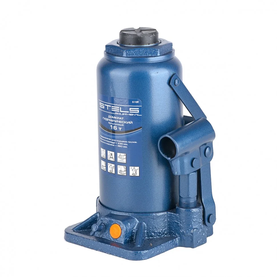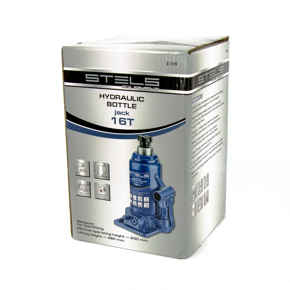 Гидравлический домкрат STELS с клапаном безопасности предназначен для подъема груза массой до 16 тонн.Домкрат является незаменимым инструментом в автосервисе, часто используется при проведении ремонтно-строительных работ.Минимальная высота подхвата домкрата STELS составляет 23 см.Максимальная высота, на которую домкрат может поднять груз, составляет 46 см.Этой высоты достаточно для установки жесткой опоры под поднятый груз и проведения ремонтных работ.Клапан безопасности предотвращает подъем груза, масса которого превышает массу заявленную производителем.Также домкрат оснащен магнитным собирателем, исключающим наличие стружки в масле цилиндра, что значительно сокращает риск поломки домкрата.ВНИМАНИЕ!Домкрат не предназначен для длительного поддерживания груза на весу либо для его перемещения.Перед подъемом убедитесь, что груз распределен равномерно по центру опорной поверхности домкрата.Масса поднимаемого груза не должна превышать массу, указанную производителем.Домкрат во время работы должен быть установлен на горизонтальной ровной и твердой поверхности.После поднятия груза необходимо использовать специальные стойки-подставки для его поддерживания.Запрещается производить любого вида работы под поднятым грузом при отсутствии поддерживающих его подставок.Перед началом работы ознакомьтесь с инструкцией по эксплуатации изделия.
