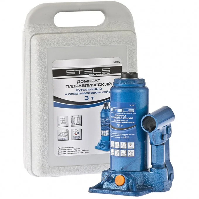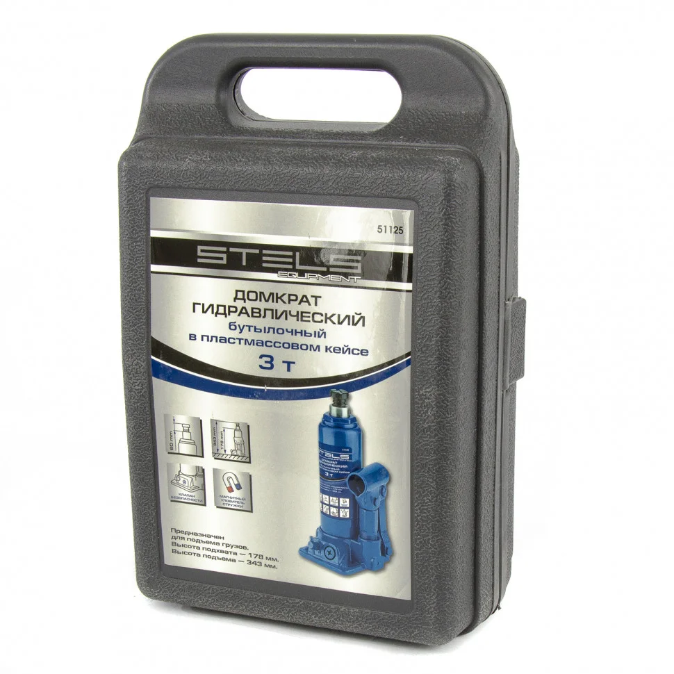 Домкрат гидравлический бутылочный, 3 т, H подъема 178-343 мм, в пластиковом кейсе Stels 51125