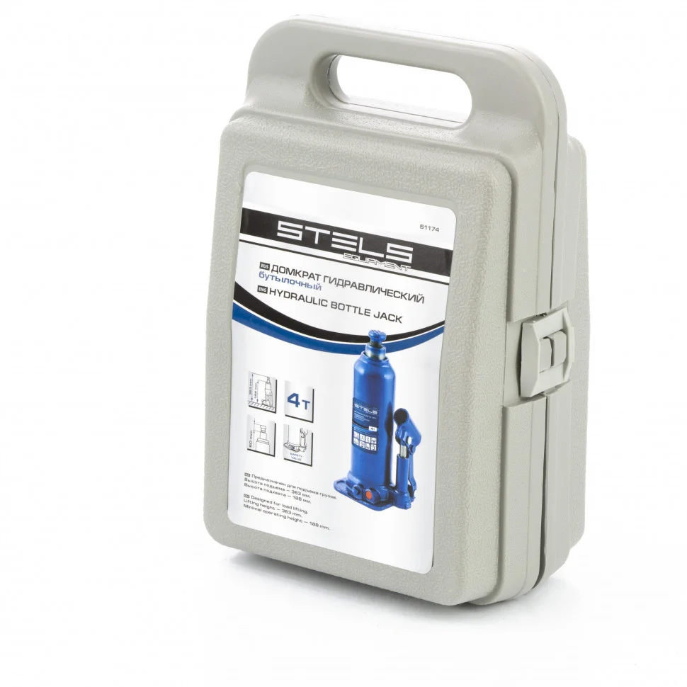 Домкрат гидравлический бутылочный, 4 т, h подъема 188-363 мм, в пластиковом кейсе Stels 51174